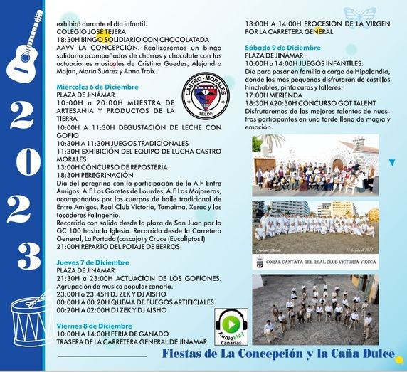 Ya el día 6 de diciembre comenzará la muestra de artesanía y productos de la tierra a las 10.00 horas, habrá degustación de leche con gofio, juegos tradicionales, exhibición del equipo de lucha Castro Morales, concurso de repostería y la tradicional peregrinación (18.30 horas), seguido por el reparto de potaje de berros (21.00 horas).