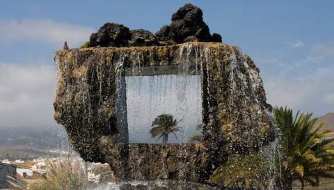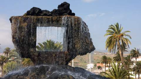 Continuamos nuestro paseo por las esculturas de esta histórica Ciudad. Nos detendremos en la zona del Cubillo para comentar la fuente que allí se encuentra. Y es que, sobre un diámetro de más de 30 metros de cono de apoyo, se levanta una Fuente-escultura elaborada con lava volcánica, hormigón y resina para los rejuntados y revestimientos; usándose básicamente la técnica de los cortes de disco, abrasivos y el collage, amén de la colocación de motores, propulsión, iluminación y circulación del agua que no percibimos apenas, pues se halla en su interior.
