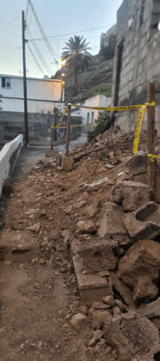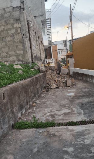 Vecinos de la calle Blas de Otero, en Jinámar, critican el estado en el que ha quedado esta vía tras el desplome de un muro hace una semana. Explican que ese mismo día precintaron la zona y solo dejaron un pasillo de unos 45 centímetros para vuelos peatones pudieran pasar.