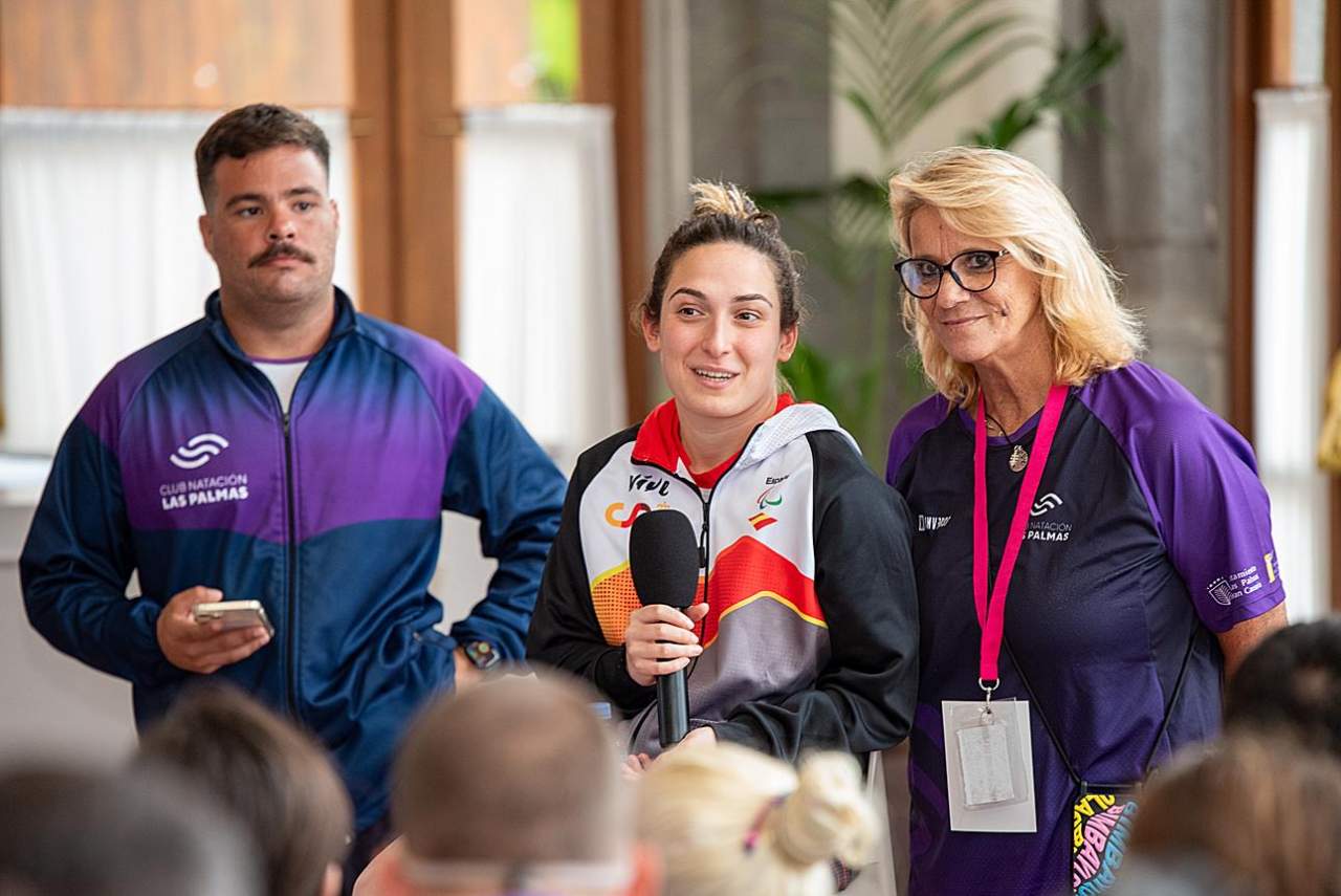 Por su parte, Ariadna Edo, que ha participado en las Paraolimpiadas de Londres 2012, Río 2016, donde conquistó la medalla de bronce en 400 metros libre categoría S13, y Tokio 2021, explicó durante la charla cómo ha sido su experiencia deportiva y que ha significado la natación para ella. Su lema es “siente la energía y déjate llevar por la magia de la natación”. Además, manifestó su entusiasmo por las los dos triunfos conseguidos hoy y señaló que “ha sido todo una sorpresa para mí ser la madrina de la competición, por lo que estoy muy gradecida. Estoy encantada de pueda estar en manga corta y nadar en piscina descubierta en diciembre”. Reconoció, además, el trabajo y la labor que hace el Club Natación Las Palmas con esta iniciativa, porque “es un impulso que le da a la natación adaptada. Eso es de agradecer y muy necesario”.