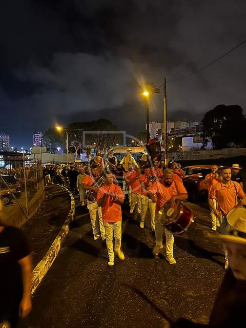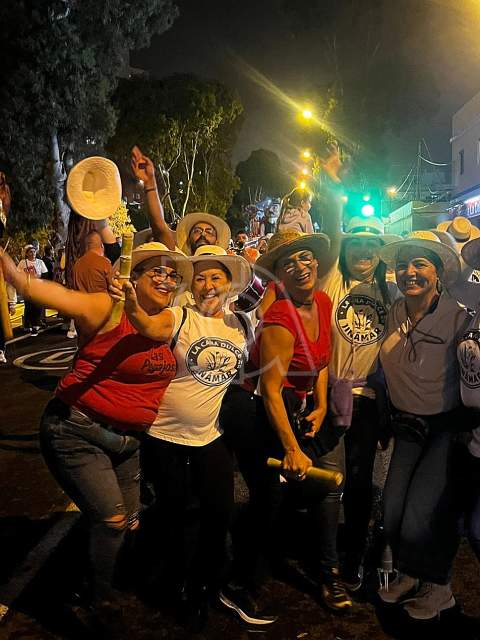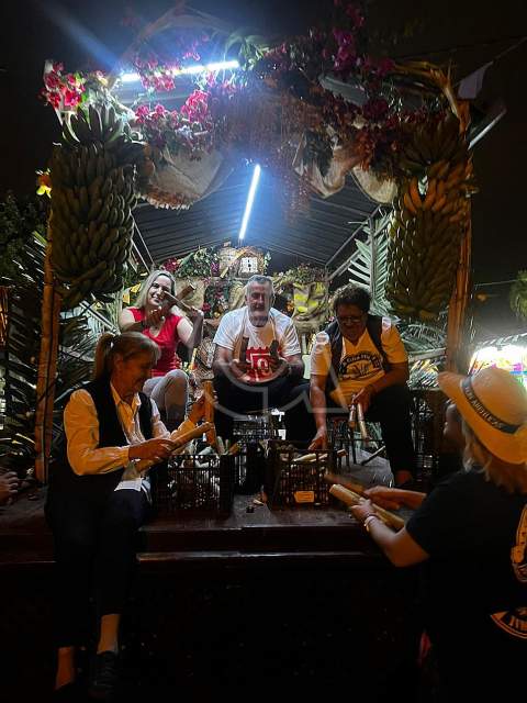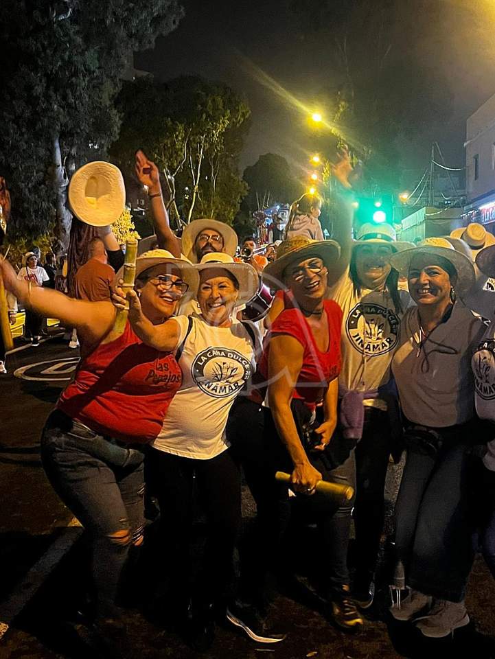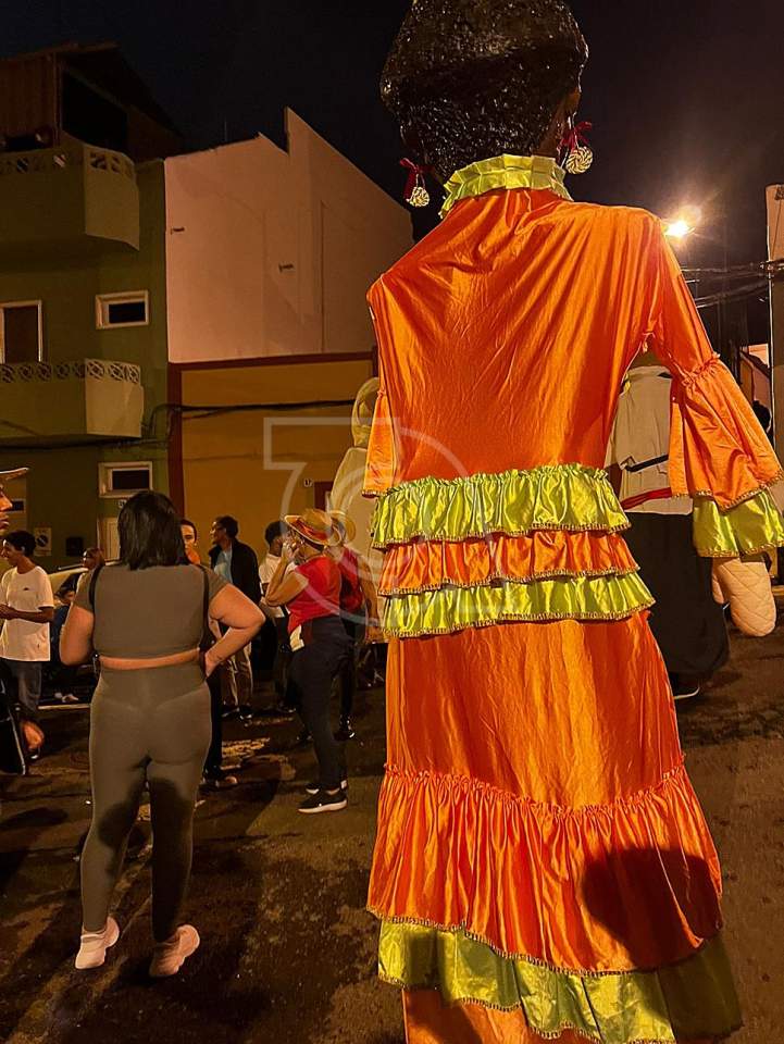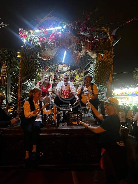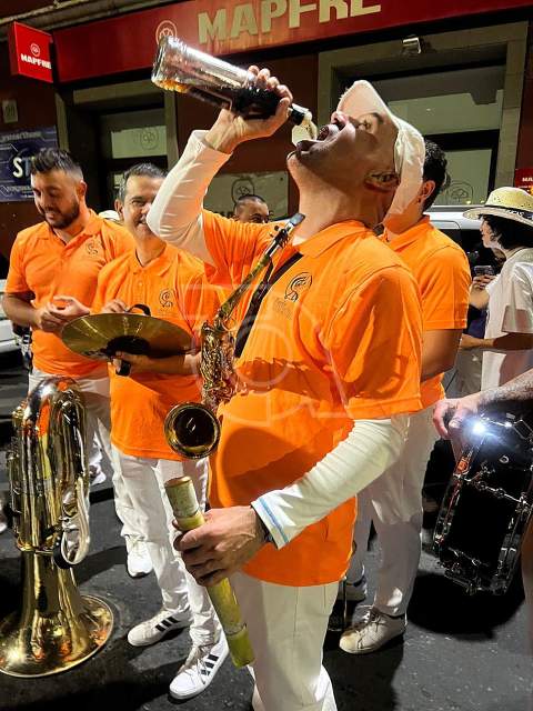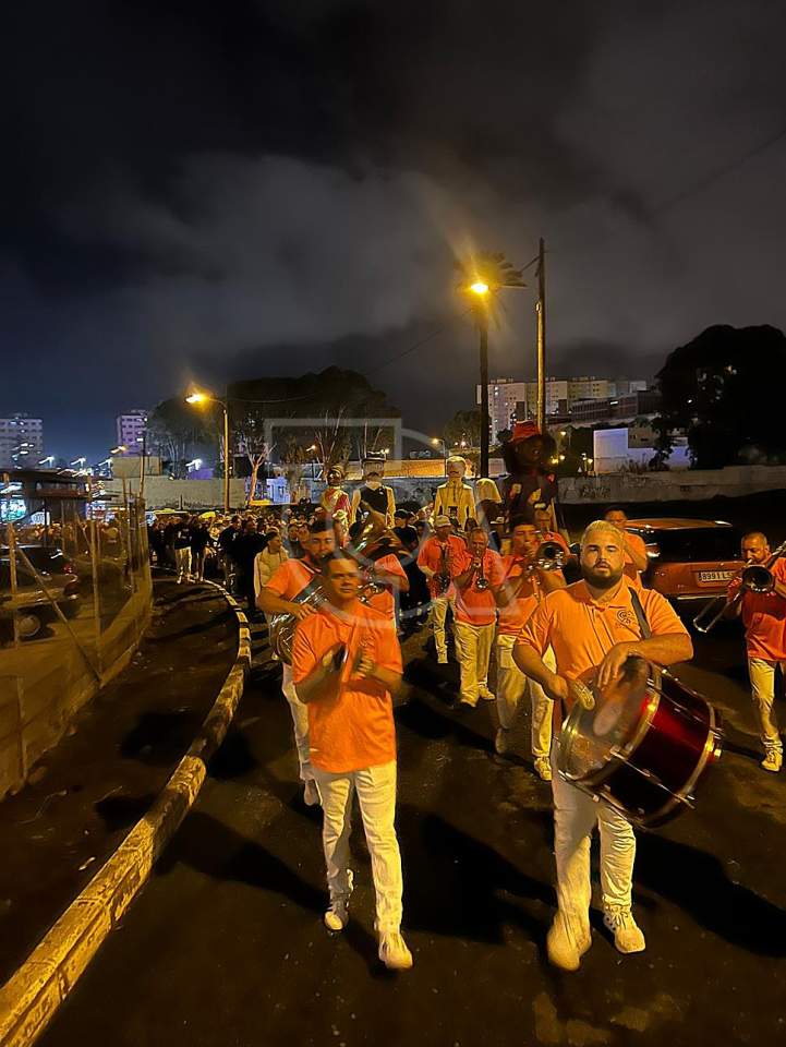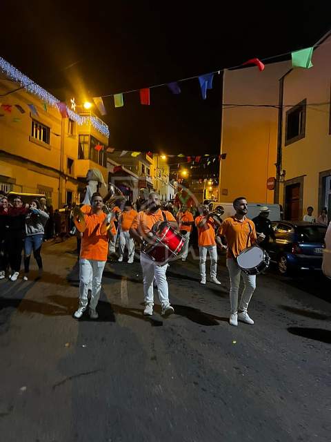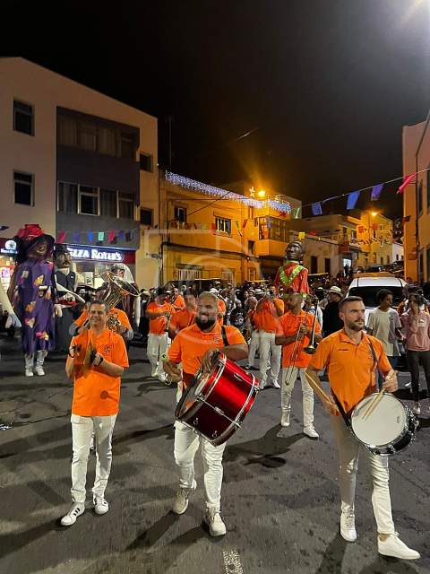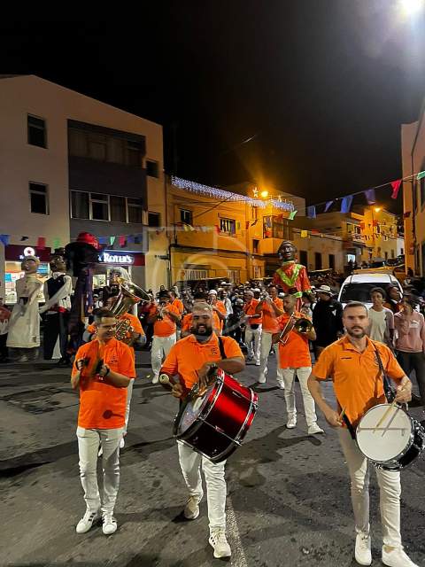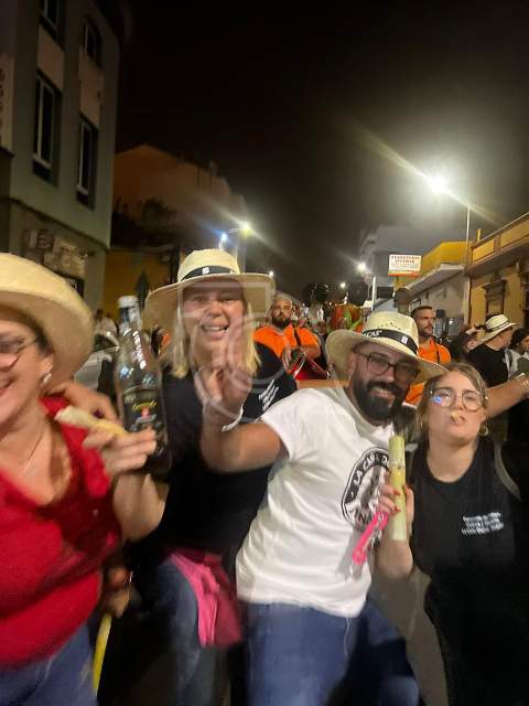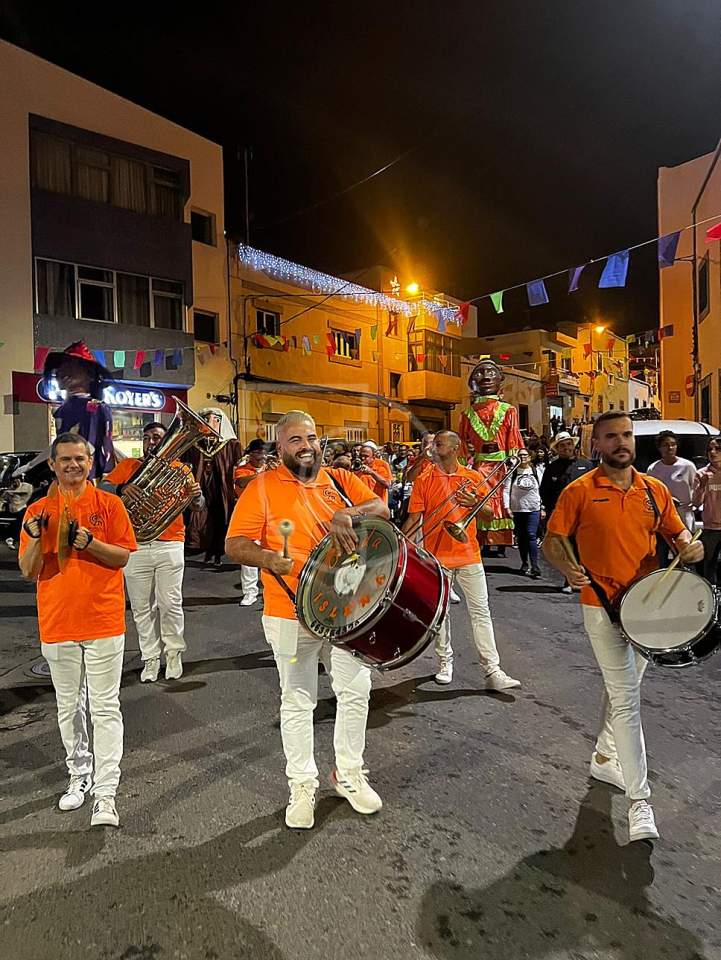 La agrupación vestida con camisetas naranjas y pantalón blanco animó con su música pachanguera el pasacalle que partió del entorno de la iglesia y recinto público y recorrió diferentes calles y enclaves que conforman el entramado urbano del pueblo de Jinámar hasta que comenzó el jolgorio de la chupada.