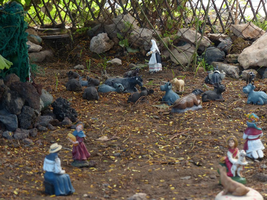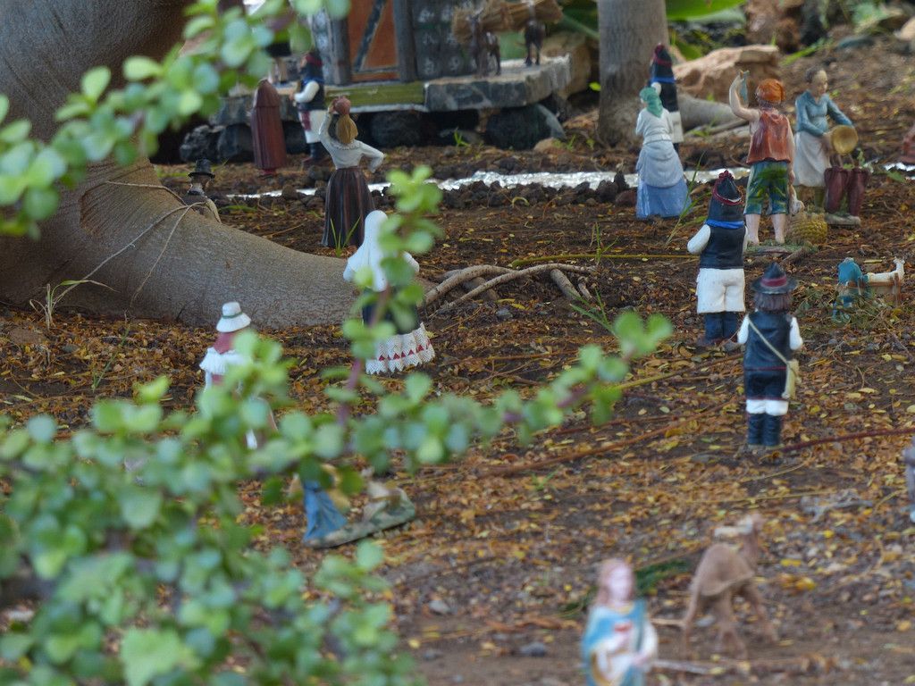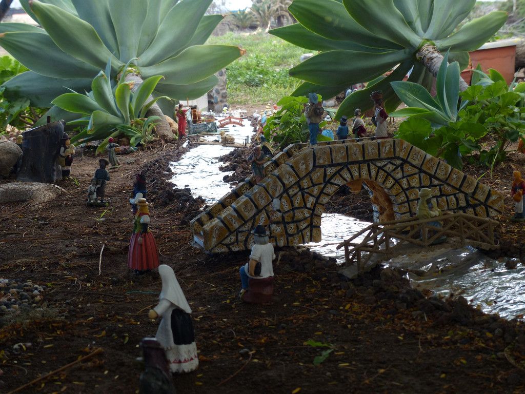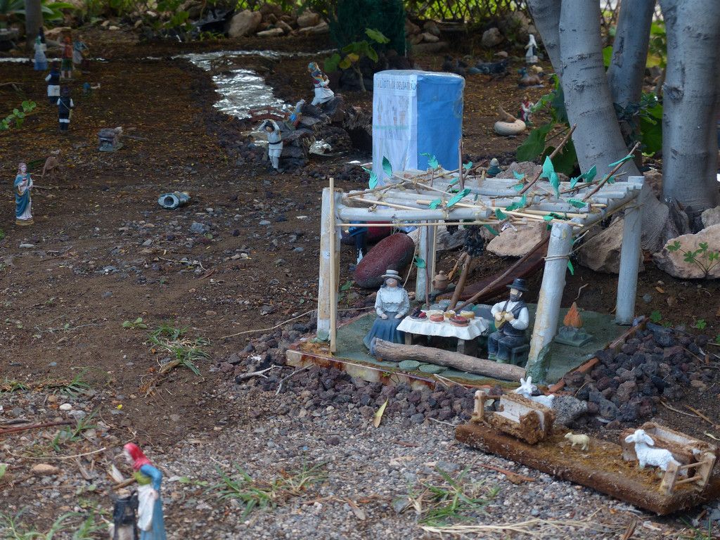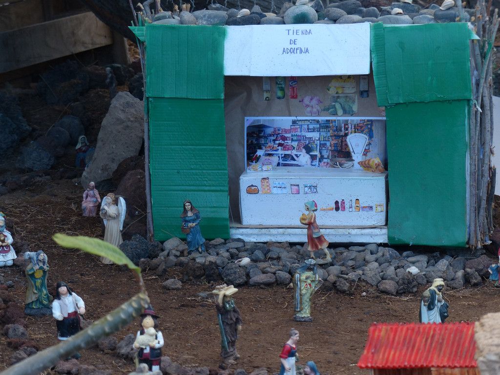 El nacimiento de este año recrea una tienda que representa su comercio de aceite y vinagre, donde trabajó casi toda su vida activa, un retrete y hasta un acueducto. Su pequeño belén de pocas piezas se ha convertido en una representación a todo lujo de detalles en un escenario de unos 15 metros cuadrados apróximadamente. Todo albergado bajo el centenario tarahal y en medio de un jardín que Adolfina cuida todo el año.