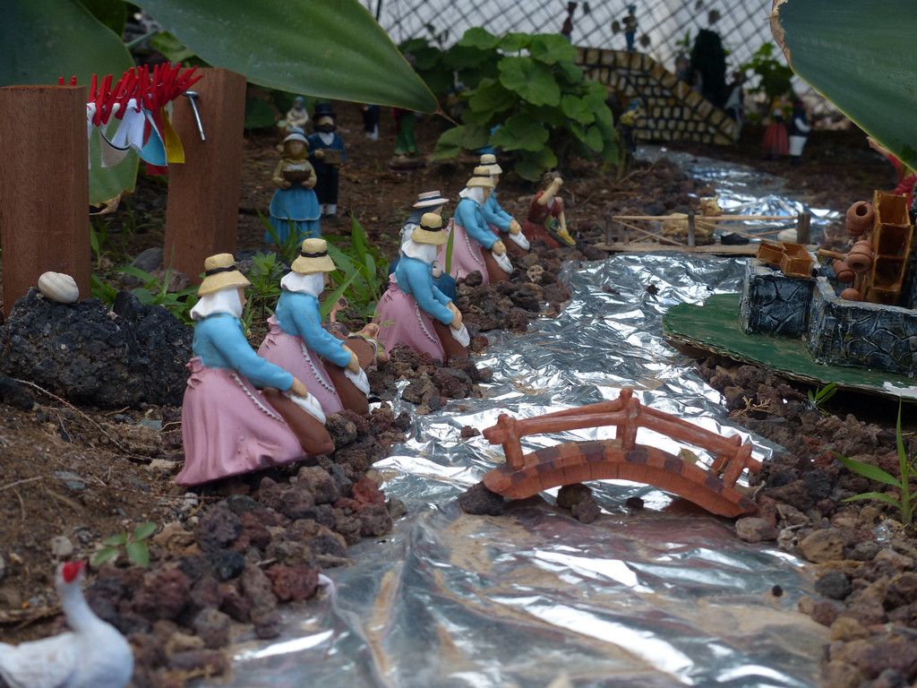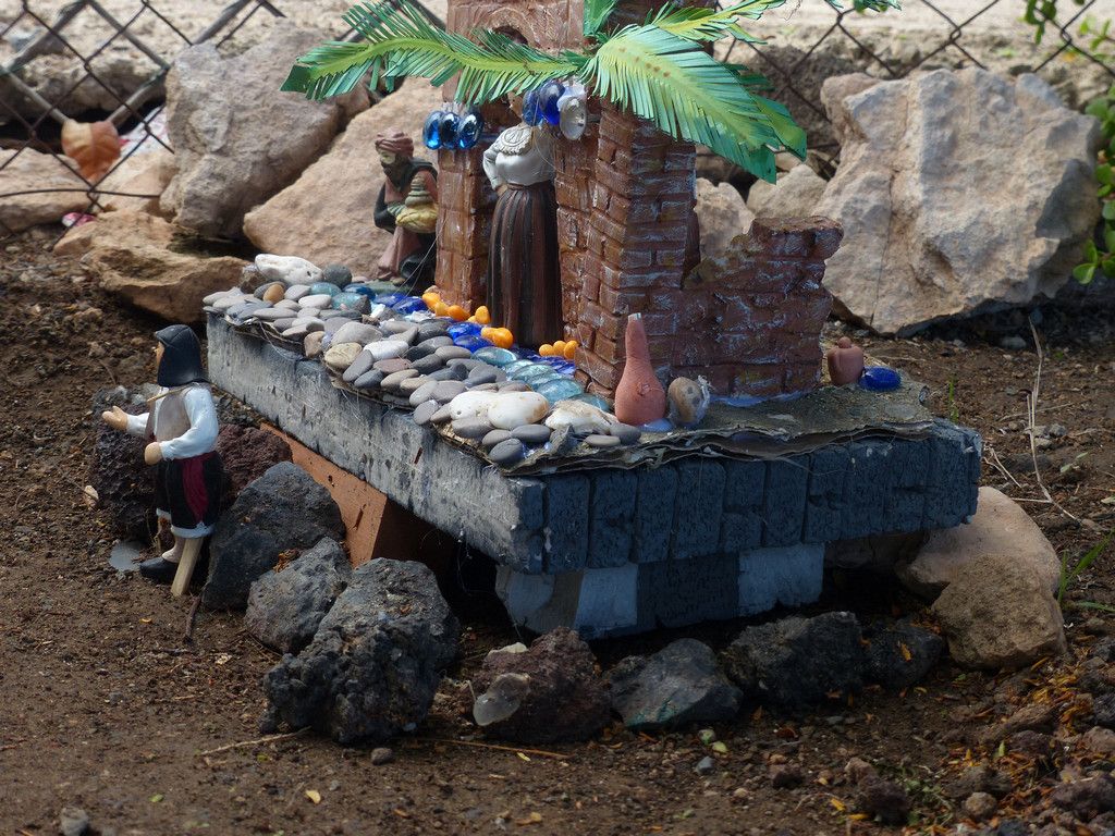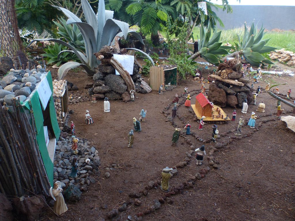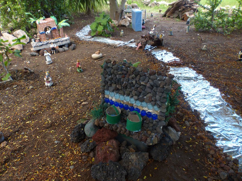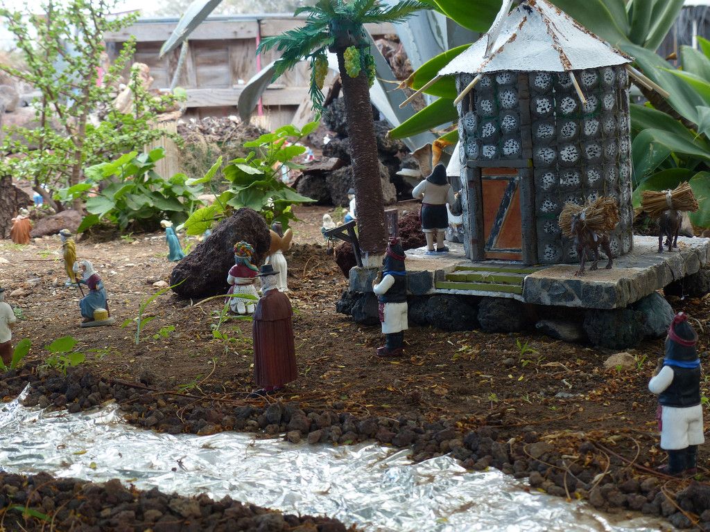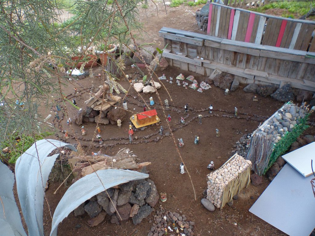 El nacimiento de este año recrea una tienda que representa su comercio de aceite y vinagre, donde trabajó casi toda su vida activa, un retrete y hasta un acueducto. Su pequeño belén de pocas piezas se ha convertido en una representación a todo lujo de detalles en un escenario de unos 15 metros cuadrados apróximadamente. Todo albergado bajo el centenario tarahal y en medio de un jardín que Adolfina cuida todo el año.