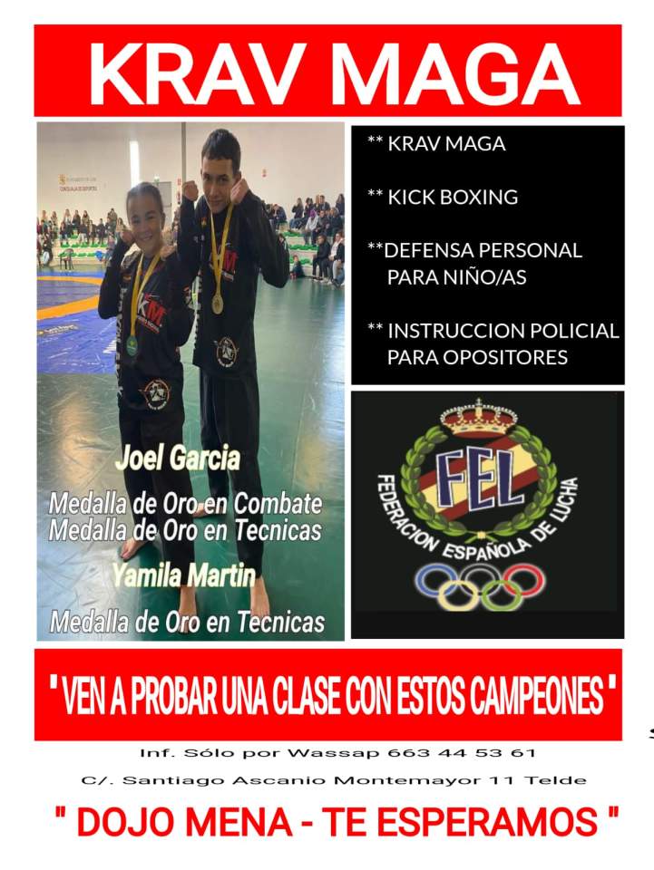 Dos alumnos del Dojo Mena de Telde, Joel García y Yamila Martín, participaron el pasado 5 de diciembre en el I Open de España de krav magá que se disputó en León bajo la organización de la Federación Española de Lucha, logrando entre ambos tres medallas de oro.