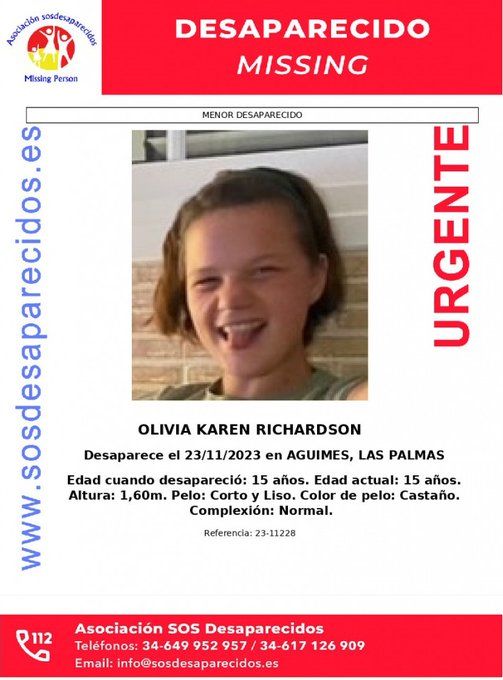 La menor, Olivia Karen R., es residente en Gran Canaria, aunque natural de Gibraltar, mide 1,60 metros, tiene una complexión normal y el pelo castaño, liso y corto.