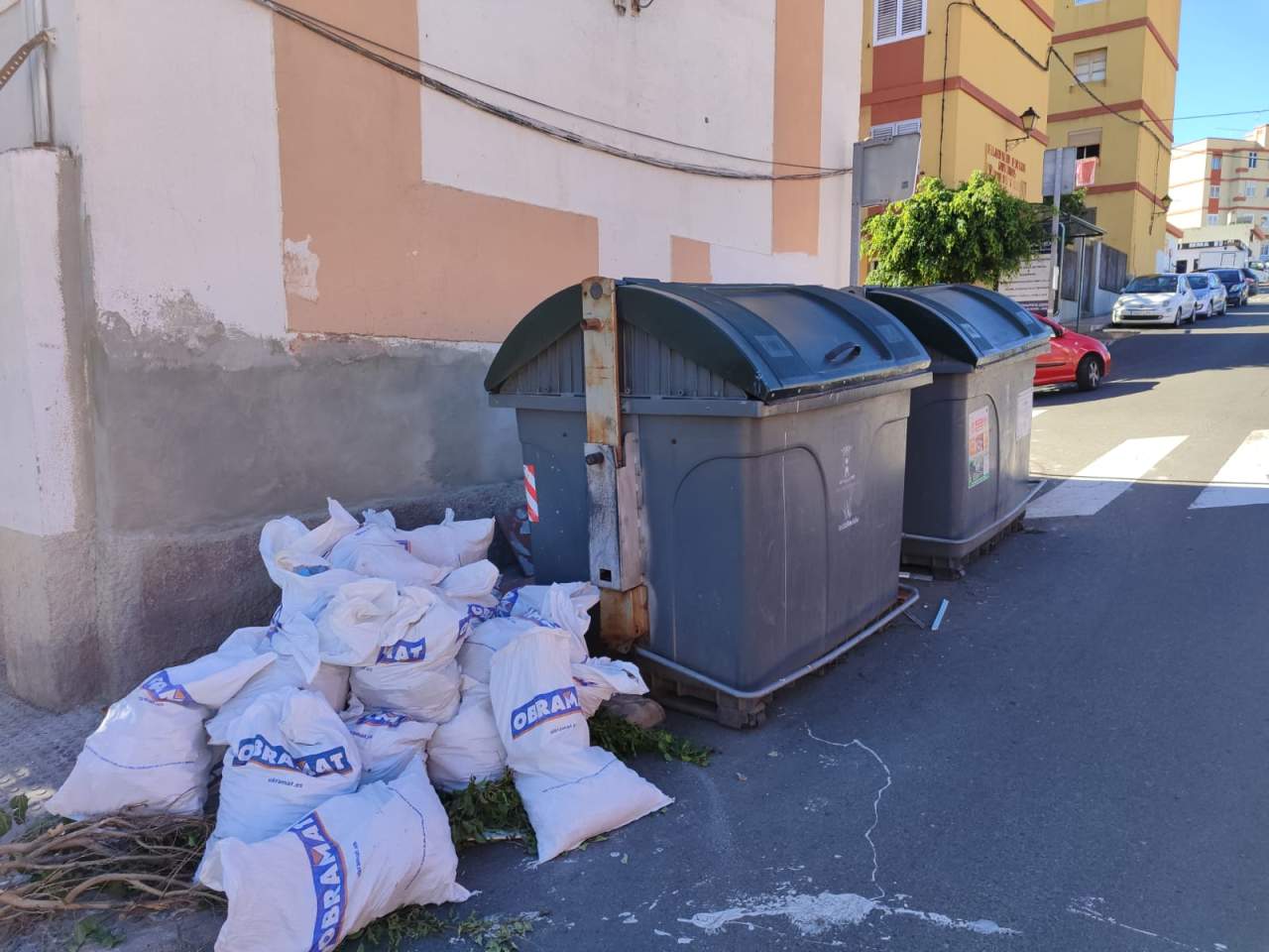 Los vecinos de San José de Las Longueras denuncian un vertido de gran cantidad de sacos de escombros depositados este viernes junto a un contenedor del barrio, que impide el paso a los peatones ya que ocupan parte de la acera.