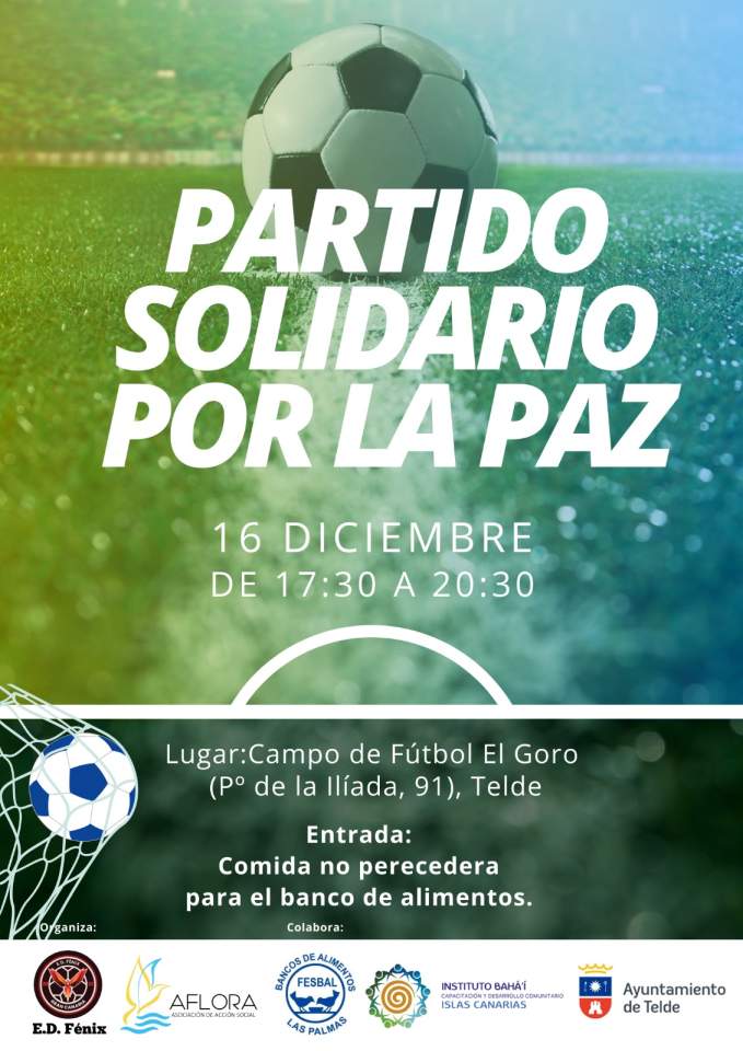 El campo de fútbol de El Goro acoge este sábado un partido solidario por la paz que tendrá lugar de 17.30 a 20.30 horas. La iniciativa está organizada por el equipo de fútbol Fénix Gran Canaria y la Asociación de Acción Social Aflora, para fomentar el juego limpio y recoger comida no perecedera para el Banco de Alimentos.