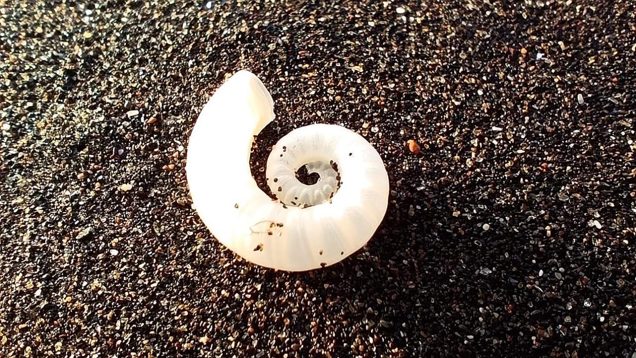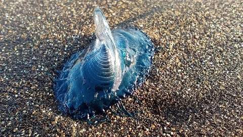 El viento sur nos trae cosas que no suelen ser comunes en la playa de Melenara o al menos no tan habituales.  Llega mucha fauna que es pelágica es decir que vive en mar abierto como la pequeña Velella velella, que son estas especies de animales con forma de medusa que tienen una vela para desplazarse, de ahí su nombre de vela de mar. Nos llegan también los caparazones de Spirula sp. una especie de choco chiquitito que vive en altamar. Cuando hay Velella es interesante buscar dragones azules porque son sus presas. Hoy no aparecieron.