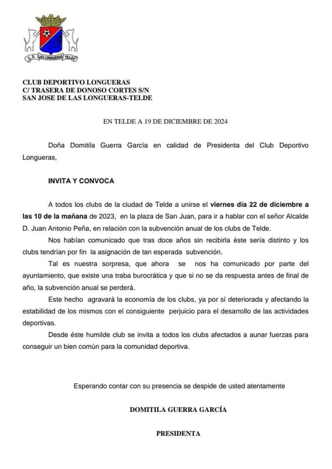 "Nos habían comunicado que tras doce años sin recibirla éste sería distinto y los clubs tendrían por fin la asignación de tan esperada subvención. Tal es nuestra sorpresa, que ahora se nos ha comunicado por parte del Ayuntamiento, que existe una traba burocrática y que si no se da respuesta antes de final de año, la subvención anual se perderá. Este hecho agravará la economía de los clubs, ya por sí deteriorada y afectando la estabilidad de los mismos con el consiguiente perjuicio para el desarrollo de las actividades deportivas. Desde éste humilde club se invita a todos los clubs afectados a aunar fuerzas para conseguir un bien común para la comunidad deportiva"; apunta la presidenta del CD Longueras, Domitila Guerra.