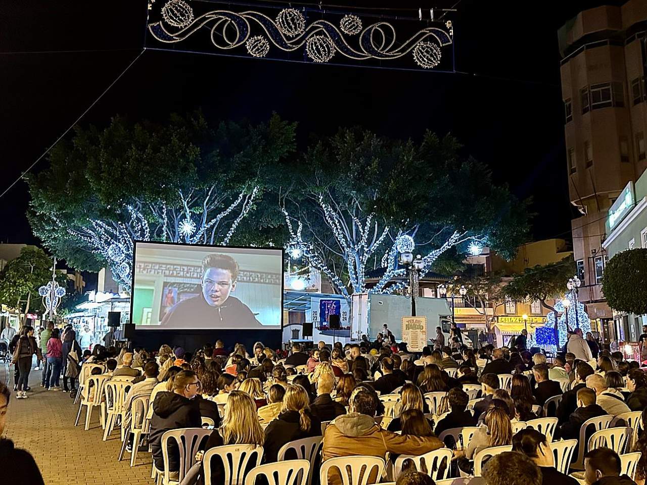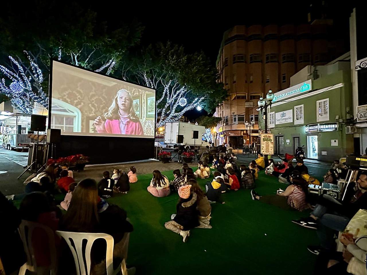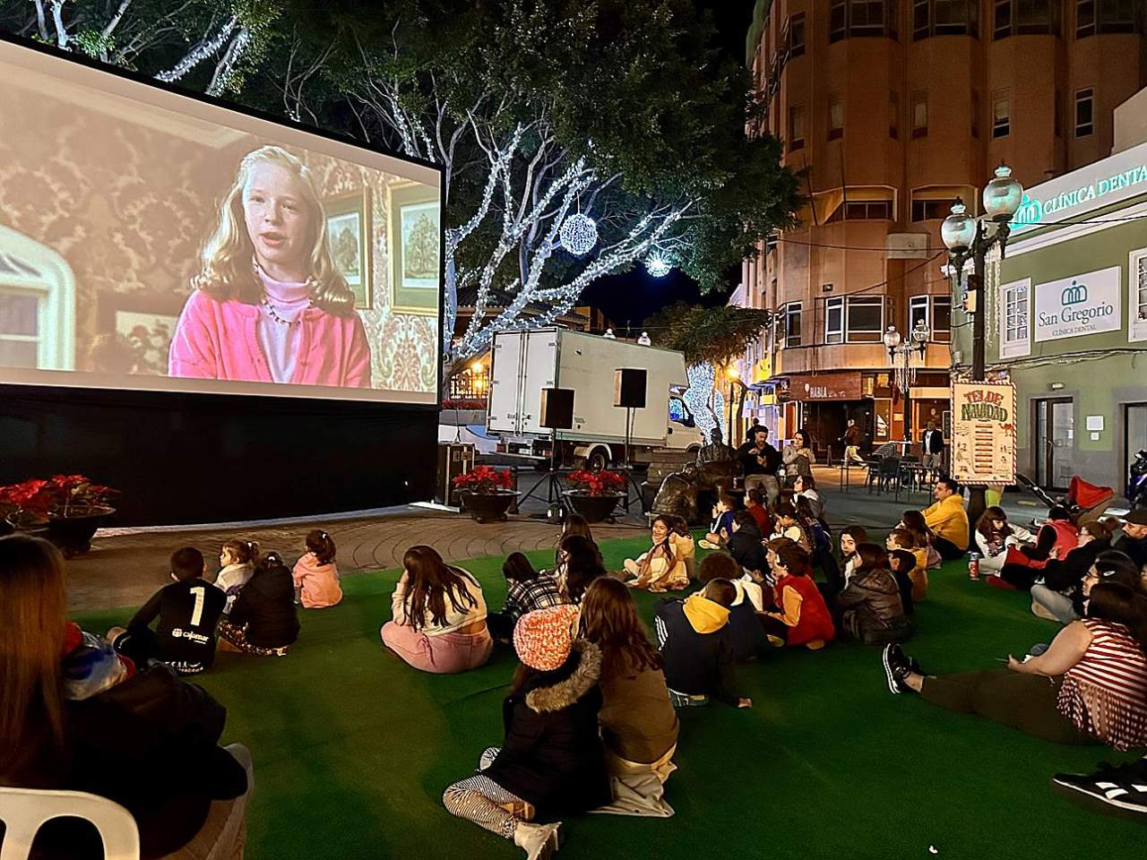 La plaza de Los Llanos acogió en la tarde de este jueves, con éxito de público, la primera sesión de Cine de Navidad, una iniciativa del Ayuntamiento de Telde que se repetirá este viernes y sábado para disfrutar de películas navideñas al aire libre.