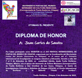 El Movimiento Poetas del Mundo ha hecho entrega a Juan Carlos de Sancho, escritor y dibujante afincado en Telde, de un diploma de honor por participar en el XVI Festival Internacional de Poetas del Mundo en Chiapas, México.