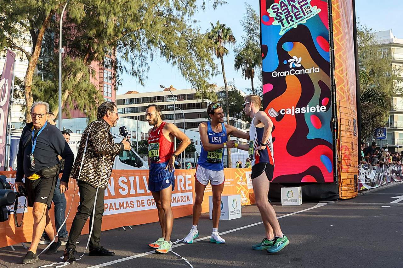 17 minutos y 30 segundos le han bastado a Francisco Cabrera para convertirse en el ganador de la edición de la San Silvestre de la capital grancanaria 2023. Como ya ocurrió en la edición pasada, Cabrera ha conseguido el mejor tiempo entre todos los participantes y revalida su título un año más. "El entrenamiento y sacrificarse cada día es clave", ha destacado indicando que se encuentra muy feliz por haber completado el primero esta carrera solidaria.