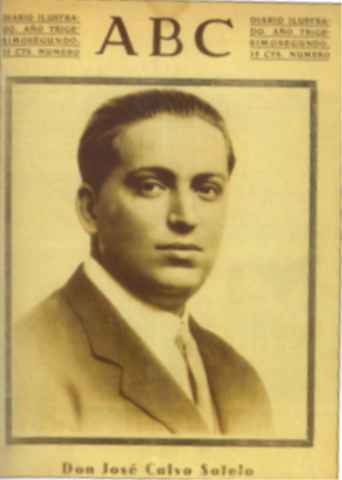 José Calvo Sotelo, había nacido en Tuy (Pontevedra), el día 6 de mayo de 1893, fue un político y jurisconsulto español, ministro de Hacienda entre 1925 y 1930, durante la Dictadura de Primo de Rivera. En un exilio autoimpuesto evitó ser juzgado por sus responsabilidades como ministro de la dictadura durante los primeros años de la Segunda República; no obstante fue elegido diputado en todas las legislaturas, incorporándose a su escaño tras una amnistía durante el bienio radical-cedista en 1934. Destacó como líder de las fuerzas que pretendían la instauración de una monarquía autoritaria corporativista, a través del partido Renovación Española.