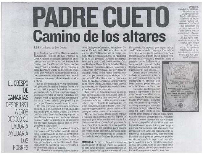 Hoy se cumplen 106 años, de aquel 17 de agosto de 1908, día en e que fallece en Las Palmas de Gran Canaria, el obispo de Canarias fray José Cueto Diez de la Maza que había nacido en Riocorvo (Santander), el 4 de noviembre de 1839. Ingresó en la Orden de los Predicadores. Allí estudió Filosofía y Teología, ordenándose sacerdote en 1863. Se dedicó a la enseñanza en Ocaña hasta 1873 en que fue destinado a Filipinas, donde se doctoró en Derecho Canónico en 1874 en la Universidad de Santo Tomás de Manila. Regresó a España en 1881 y hasta 1889 enseñó Teología y Derecho Canónico en el Convento de Santo Tomás de Ávila. Tras regresar a su casa de Ocaña, es nombrado obispo de Canarias en 1891, diócesis donde desarrollo un trabajo de promoción de escuelas para erradicar el analfabetismo, creación de centros sociales para niños y ancianos y cesión de su palacio episcopal para hospital de sangre a los soldados repatriados venidos de Cuba.