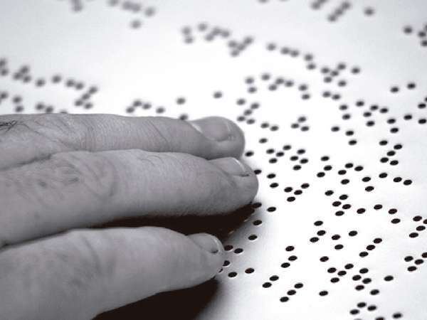Una celda de braille consiste en seis puntos en relieve perceptibles al tacto. El sistema Braille, por ser originario de Francia, utilizó muchos símbolos correspondientes a las 64 combinaciones de los seis puntos que lo originan, para representar acentos especiales correspondientes al francés. Al emplearse en otros idiomas, las combinaciones de puntos braille cambian de significado. Por ejemplo, el punto final y el signo de mayúscula cambian del español al inglés. Los ciegos tienen muy desarrollados los otros sentidos. Leen al tacto, moviendo la mano de izquierda a derecha por el texto marcado por puntos y guiones en relieve.