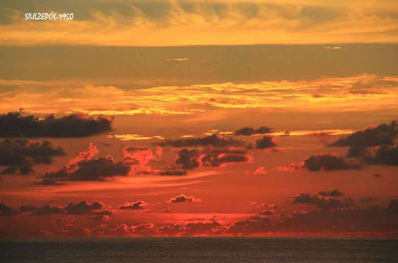 Abajo contemplamos una hermosa vista del Casco Urbano y de una gran parte del litoral municipal, el cielo se ha vestido de un azul limpio y tras nosotros el sol empieza a caer en el letargo de un nuevo ocaso que va dibujando formas fantasmagóricas con la silueta de nuestro relieve.