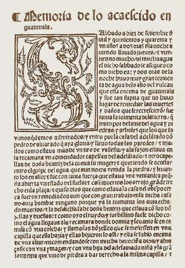 Existe un testimonio directo del terremoto e inundación que destruyó Guatemala narrado por un testigo sobreviviente, cuyo relato fue impreso en México en la imprenta de Juan Cromberger a fines de 1541, como una hoja volante (cuatro hojas en letra gótica) bajo el título de « Relación del espantable terremoto que agora ha acontecido nuevamente en la ciudad de Guatemala: es cosa de grande admiración y de grande ejemplo para que todos nos enmendemos de nuestros pecados y estemos apercibidos para cuando Dios fuere servido de nos llamar ». Es este uno de los primeros impresos civiles novohispanos de carácter no religioso ni relacionado con las necesidades de la evangelización (como era casi todo lo que se publicaba entonces en el virreinato). Dicho texto se ha considerado de interés tanto para la historia de las mentalidades como para la historia de la ciencia.