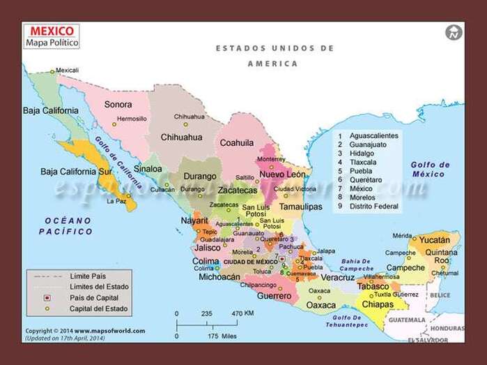 Méjico, o también México oficialmente llamado Estados Unidos Mexicanos, es un país situado en la parte meridional de América del Norte. Limita al norte con los Estados Unidos de América, al sureste con Belice y Guatemala, al oeste con el océano Pacífico y al este con el golfo de México y el mar Caribe. Es el décimo cuarto país más extenso del mundo, con una superficie cercana a los 2 millones de km². Es el undécimo país más poblado del mundo, con una población que a mediados de 2013 ronda los 118 millones de personas, la mayoría de las cuales tienen como lengua materna el español, al que el estado reconoce como lengua nacional junto a 67 lenguas indígenas propias de la nación.