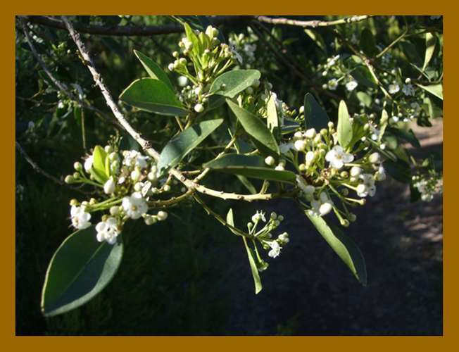 Florece de diciembre a marzo. Sus pequeñas flores bisexuales de 1 cm. de diámetro son pentámeras, con pétalos de color blanco cremoso y muy fragantes, que aparecen en racimos colgantes y de forma acampanada.