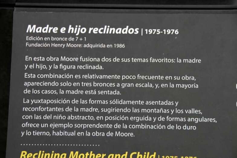 Combina formas llenas y redondeadas con puntos afilados enfrentados entre sí pero que nunca llegan a tocarse. La idea inicial procedía de una pequeña piedra hallada en el estudio de Moore que tenía dos puntos en contacto en medio de una forma hundida. A partir de aquí, el escultor modeló primero una maqueta de yeso que después amplió de tamaño para crear un modelo de trabajo en bronce, hasta alcanzar esta versión monumental. En Madre e hijo reclinados el escultor fusiona dos de sus temas favoritos: la madre y el hijo, y la figura reclinada. Esta combinación es relativa poco frecuente en su obra, apareciendo solo en tres bronces a gran escala, y, en la mayoría de los casos la madre está sentada. Ofrece un ejemplo sorprendente de la combinación de lo duro y lo tierno, habitual en la obra de Moore.