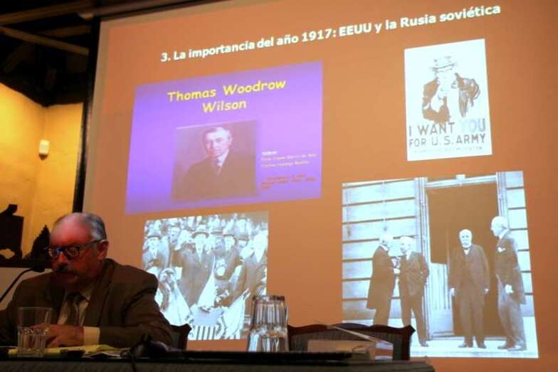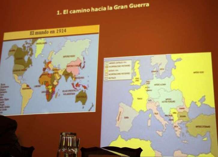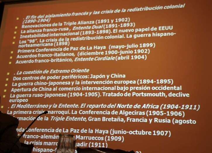 Interviene el profesor Pereira Castañares: “Mi agradecimiento a todos y sobre todo al profesor Ponce por contar con mi presencia, a la Casa Museo León y Castillo en la persona de D. Antonio González por su apoyo. El mundo que encontramos en 1914, es un mundo eurocéntrico, es decir, Europa es la que domina, Europa es la que controla, la que dicta las normas internacionales, dicta el orden internacional, y los europeos se consideran que son los que siguen mandando, los que dictan esas normas, aunque, como veremos, desde finales del siglo XIX se están produciendo ya algunos acontecimientos, que están marcando lo que va a ser el siglo XX y que, posteriormente, la Primera Guerra Mundial va a consolidar. En el mapa la situación de Europa en 1914 está formada por los bloques. Los hechos que nos llevan a la Primera Guerra que van a ser determinantes. Los dos grandes bloques de Alianzas, La Triple Alianza y la Triple Entente, ya a partir de 1890-1904 es un período muy interesante para entender lo que va a ocurrir después. A partir de 1891 se produce un cambio con la iniciativa francesa y rusa de aliarse, de establecer una entente dual, para romper el aislamiento a que ha sido sometido por parte de los alemanes desde 1871.