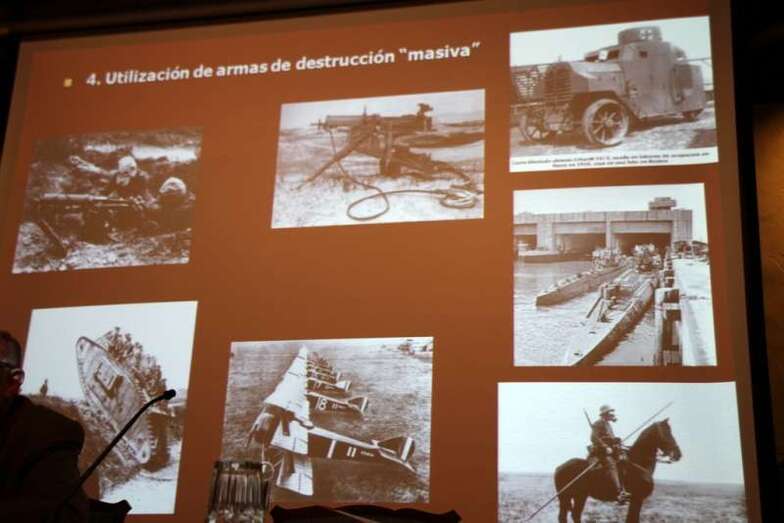 La Guerra Mundial fue la última con gran protagonismo de los Reyes y Príncipes, es “el fin de la idea imperial”. Y la última guerra “civilizada” según la definición clásica de la época. La última guerra defensiva, guerra de trincheras que se extendieron a lo largo de 40.000 kms, desde Bélgica a Suiza. Uso de nuevas armas de invasión masiva, los tanques, ametralladoras, aviones, submarinos, gases, lanzallamas, y las terribles alambradas, todas armas de destrucción “masiva”. Debido al reclutamiento de hombres para participar en la contienda las mujeres se incorporan al mundo laboral, con su consiguiente impacto social. El uso de propaganda como arma de combate, esfuerzo sistemático dirigido a obtener apoyo público para una opinión o una actuación, utilización de la radio o el cine, el espionaje, el pacifismo y la ruptura de la izquierda. El primer genocidio de la historia, 800.000 muertos en Armenia. Decadencia de Europa y lo europeo. Un balance humano aterrador 9-10 millones de muertos, 21 millones de heridos, pandemia de gripe española 1918-19, 25/30% de víctimas civiles.