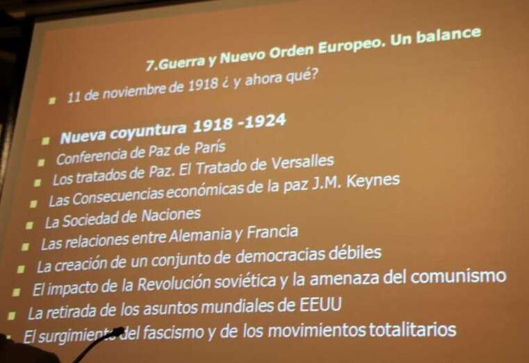 Acabada la Guerra, 11 de noviembre de 1918 surge un nuevo orden europeo ¿y ahora qué? Una nueva coyuntura 1918-1924. Conferencia de Paz en París. Los Tratados de Paz. El Tratado de Versalles. Las consecuencias económicas de la Paz J. M. Keynes. La sociedad de Naciones. Las relaciones entre Alemania y Francia. La creación de un conjunto de democracias débiles. El impacto de la Revolución soviética y la amenaza del comunismo. La retirada de los asuntos mundiales de EEUU. El surgimiento del fascismo y de los movimientos totalitarios”.