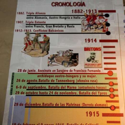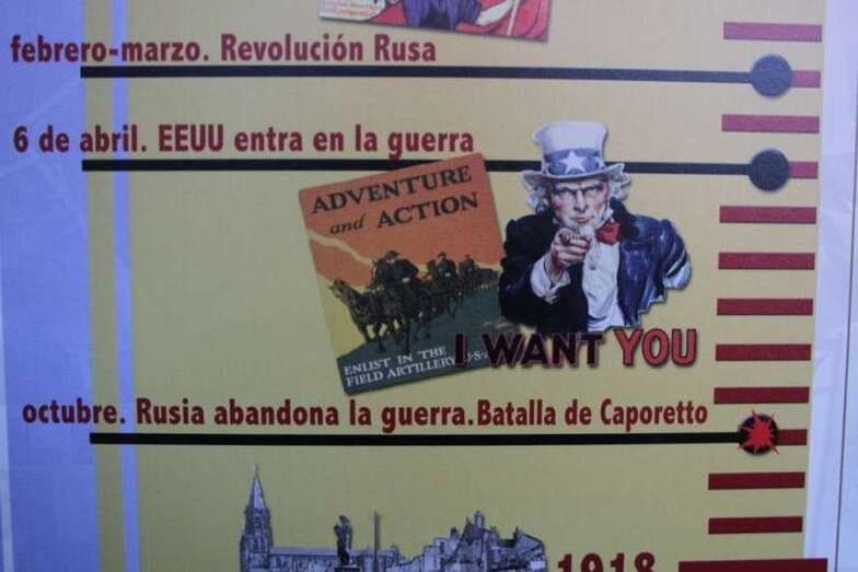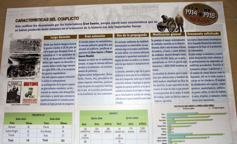 A través de siete paneles expositivos se ofrece una visión de la evolución de este acontecimiento histórico, detallándose las causas y características del mismo, las distintas fases de la contienda, las consecuencias de la guerra, las innovaciones tecnológicas aplicadas, la organización de la paz tras el cese de las hostilidades a partir de noviembre de 1918, y el papel de España y Canarias.
