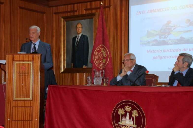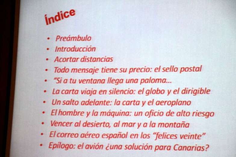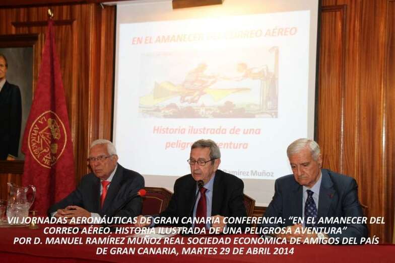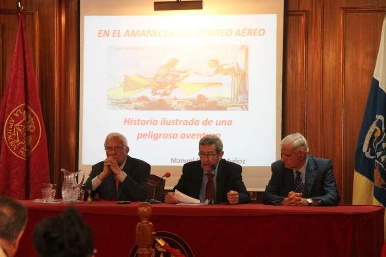 Se inicia la primera conferencia: En el amanecer del correo aéreo. Historia ilustrada de una peligrosa aventura que imparte el capitán retirado del Ejército del Aire, Doctor en Geografía e Historia Contemporánea, D. Manuel Ramírez Muñoz: “Hacernos pensar en aquel amanecer del correo aéreo y en aquellos primeros pasos de la Aviación comercial que nacieron con él, forjados en el dolor y en la voluntad inaccesible de unos pioneros que no dudaron en enfrentarse al tiempo, a la distancia, a la noche, a los elementos para llegar a la realidad de lo que es hoy la aviación. La historia del correo como fórmula de comunicación y de la carta y mensaje como puente de relación entre grupos o entre personas, es la historia de un largo proceso de realización de un servicio que como pocos ha contribuido al progreso de la Humanidad. Es la historia de un deseo de acortar el tiempo entre el emisor y el receptor y en el que la aviación jugó un papel de extraordinario interés”.