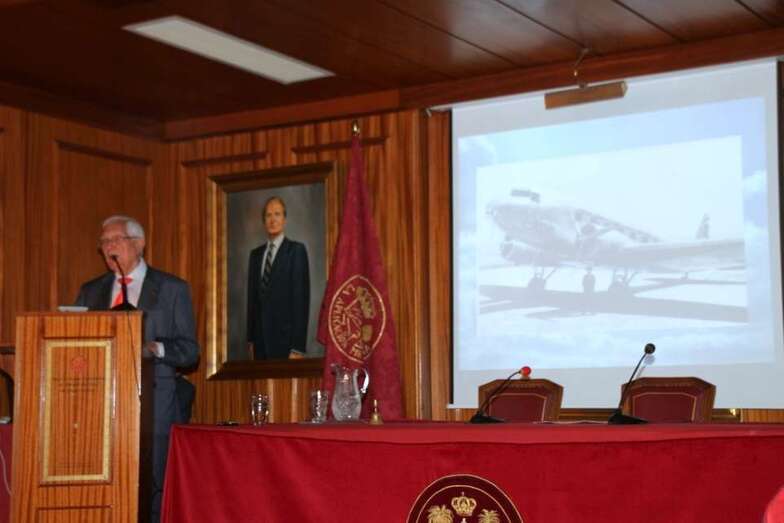 Interviene D. Manuel Ramos Almenara, abre el acto dedicando sus primeras palabras “A la memoria de los que perteneciendo a la aeronáutica nos dejaron durante el Centenario y en estos días aciagos del pasado mes de marzo, y con el sufrimiento de todos sus deudos y profesionales que por sus trabajos y obligaciones, como el sargento Ojeda Alemán, han padecido avatares insufribles, así como el piloto Agustín Pastor que en Agadir tuvo que volver a Sevilla por una tragedia familiar. En el 29 de abril cuando se cumple un nuevo aniversario de la incorporación de Gran Canaria a la Corona de Castilla, se inician las VII Jornadas Aeronáuticas de Gran Canaria, recordando las raíces aeronáuticas de esta patriótica institución, de la mano de su más preclaro director que fuera el insigne Viera y Clavijo, quien en diciembre de 1783, confeccionó un pequeño globo de tafetán y lanzándolo al aire emuló a aquel de Montgolfier parisino, y el de su paisano Agustín de Bethencourt que 15 días antes hiciera lo mismo. Fueron por tanto los iniciadores de la aerostación en España. Asimismo Maffiote, socio de esta Económica, en la segunda mitad del siglo XIX, en Tenerife diseñó un globo en forma de disco.