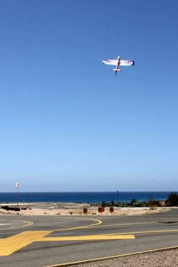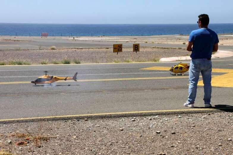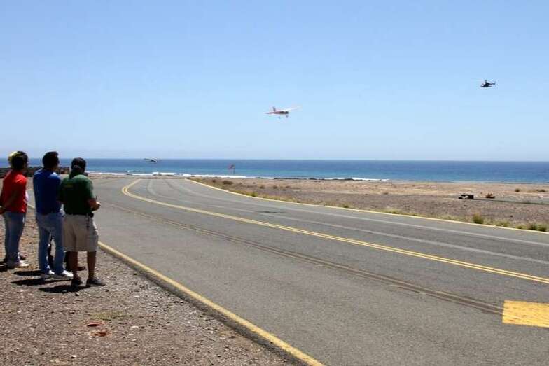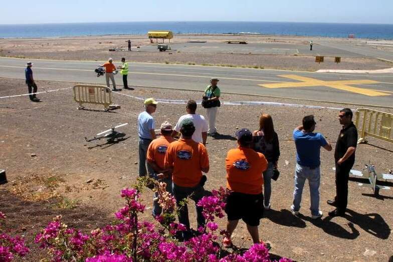 Previo al descubrimiento de la placa conmemorativa disfrutamos de una exhibición de aeromodelismo en acción. Diferentes modelos de aviones, helicópteros teledirigidos hábilmente manipulados por sus propietarios y especialistas en esta bonita especialidad deportiva aérea, dirigidos por los jefes de campo y operaciones en pista del Aeroclub. Mañana que se prestaba para salir a volar, de hecho helicópteros, aeroplanos, ultraligeros, no cesaban de aterrizar y salir al aire, creo que la temperatura, el viento y el buen día, favorecía el participar de un buen vuelo para admirar nuestra costa y paisaje desde las alturas bajo el cielo sureño de Gran Canaria.