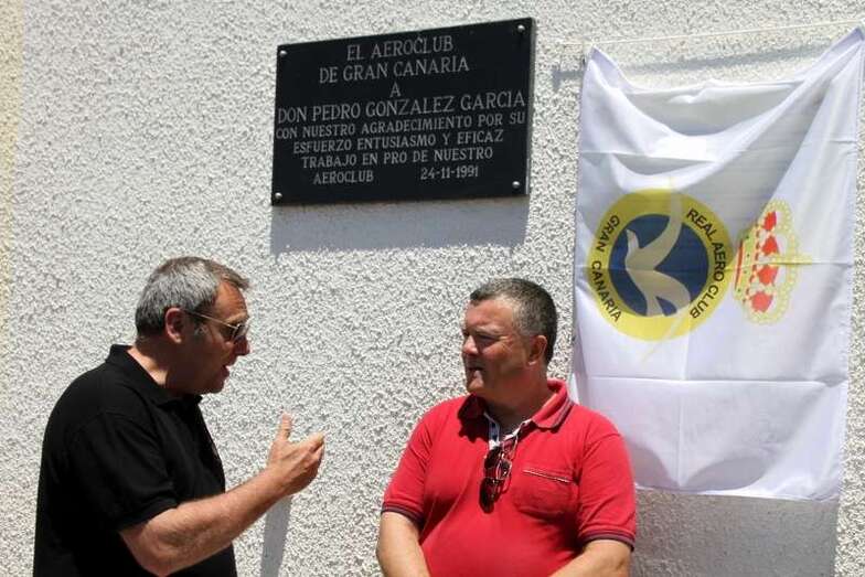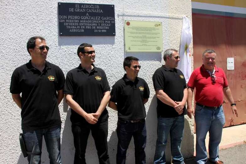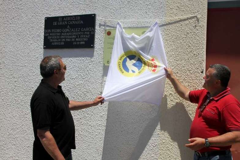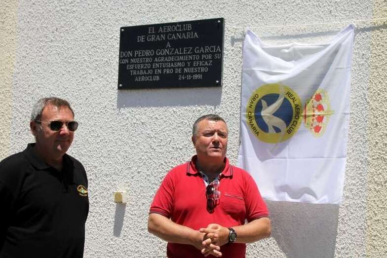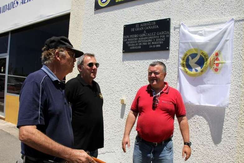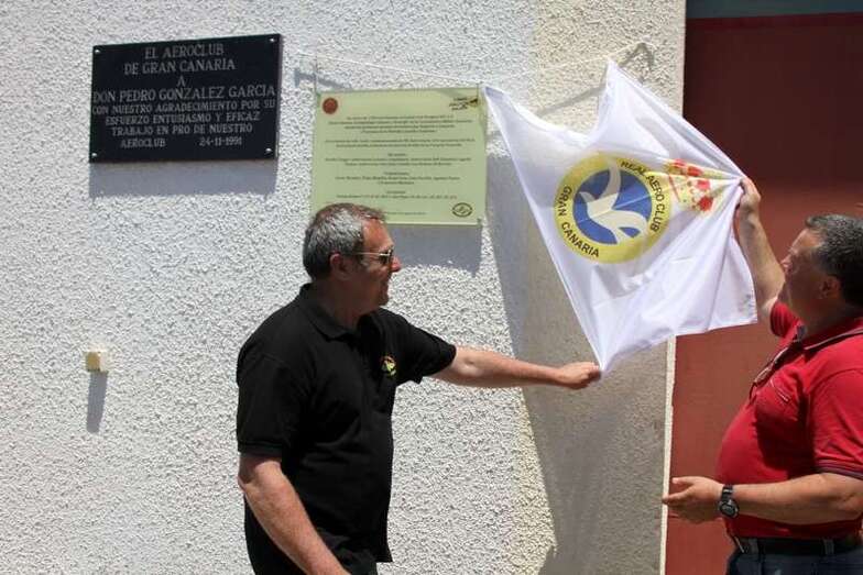 Seguidamente se descubre la placa que figura sobre la blanca pared del edificio de la Escuela de Pilotos Comerciales del Real Aeroclub de Gran Canaria, Centro de Formación y Actividades Aeronáuticas, justo al lado de la placa dedicada a la memoria de D. Pedro González García, benefactor y entusiasta que realizó un esfuerzo y eficaz trabajo en pro del Aeroclub. La placa recién descubierta reza: