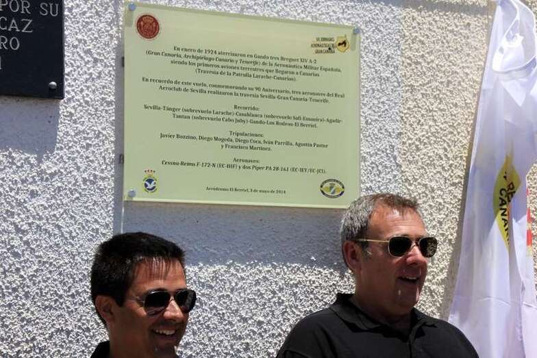 Posteriormente el descubrimiento de una placa conmemorativa que recuerda la travesía que han realizado los pilotos de la patrulla Sevilla-Canarias, a los que se les ha recibido calurosamente y dedicado, con su presencia, participación en conferencias, visitas a Instituciones y Museos, entrega de reconocimientos y medallas, en el agradecimiento de esta gesta que rememora la realizada hace 90 años, en enero de 1924 aterrizaron en Gando tres Breguet XIV A-2 (Gran Canaria-Archipiélago Canario y Tenerife) de la Aeronáutica Militar Española, siendo los primeros aviones terrestres que llegaron a Canarias (Travesía de la Patrulla Larache-Canarias).