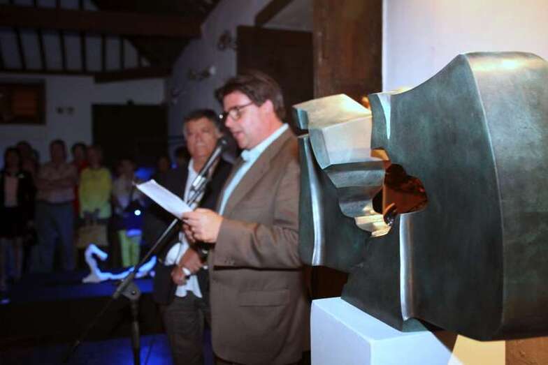 Interviene el crítico de arte y conocedor de la obra escultórica de Riol, D. Jonathan Allen: “Buenas noches. Me alegro mucho de estar aquí esta noche, en esta sala que ocupa una entidad privada para la exposición de sus eventos, sea cual sea su naturaleza. Antes de abordar la obra de Máximo Riol que aquí se inaugura, quiero insistir en la determinante dimensión de la gestión privada en esta Europa compleja y crítica que nos ha tocado vivir. Tras veinte largos años de iniciativas, proyectos, comisiones e informes relacionados con la vida cultural pública de este Archipiélago, que directa o indirectamente me han tocado vivir, y que siempre reivindicaré porque he intentado actuar con claridad y objetividad, estoy plenamente convencido de que la sociedad civil organizada en grupos y asociaciones, es la última y mejor garante de la vida cultural de un pueblo, ciudad región o comunidad.