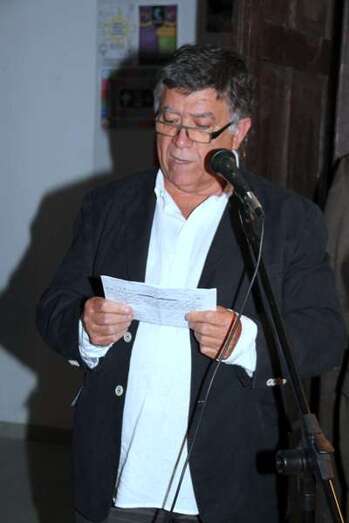 Interviene el escultor Máximo Riol: “Buenas noches amigos y amigas. A César. Con esta exposición quiero hacer un homenaje a César, con el que tuve el honor de compartir sala en San Antonio Abad, en la gran exposición que se celebró con motivo del Centenario de la U.G.T en el año 1988 (hace ya la friolera de 26 años). César fue una persona que defendió Lanzarote con uñas y dientes y habría sufrido mucho si hubiese visto el desmadre urbanístico que después de su muerte se cometió en toda España.