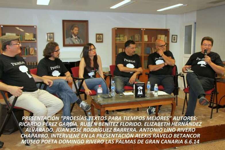 En la tarde del pasado viernes 6 de junio fue presentado en el Museo Poeta Domingo Rivero, de la calle Torres, de Las Palmas de Gran Canaria el libro “Proesías, Textos para tiempos mejores”, obra de los cinco coautores: Rubén Benítez Florido, Elizabeth Hernández Alvarado, Ricardo Pérez García, Antonio Lino Rivero Chaparro y Juan José Rodríguez Barrera, escritores con algo en común que les caracteriza, su amor, su locura por la literatura y como bien dice el prólogo al referirse a sus escritores que han compartido esta creación literaria.