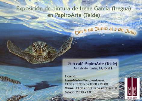 Telde.- El pub café Papiro Arte acoge hasta el próximo 3 de julio una exposición de la artista Irene García (Iregua) que se inauguró el pasado 5 de junio. Se puede visitar en las instalaciones de la Avenida Cabildo Insular, 43, local 1, en la zona de Arnao.