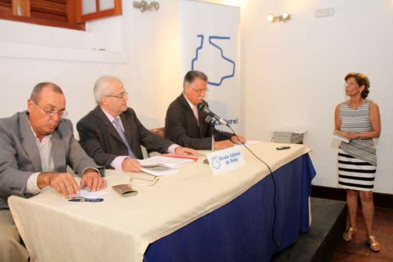 La presidenta del Círculo Cultural de Telde doña Lucana Falcón León da la bienvenida al autor y personas de la mesa de presentación, el marino mercante, escritor, autor de varias obras sobre el Puerto de La luz y novelas, D. Julio César González Padrón, y D. Juan Miguel Sánchez de Armas, colaborador en la realización de este libro y puede considerarse coautor, quien entrega a Lucana Falcón, en nombre de la editorial un libro del Valbanera, autografiado por el autor, para la biblioteca del Círculo.