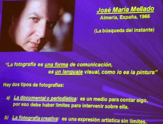 José María Mellado dice que la fotografía es una forma de comunicación, es un lenguaje tan visual como lo es la pintura. Hay dos tipos de fotografía a efectos de lo que nos interesa: la fotografía documental o periodística que es la que trato aquí básicamente, un medio para contar algo y por eso tiene que haber unos límites en la intervención que se hace sobre ella, porque es una documentación. Luego hay otro tipo de fotografía que es la creativa, no tiene límites, es como el trabajo, la imagen de un pintor. No es lo mismo un retrato que tiene que ser fiel al original, por ejemplo Picasso hace otra cosa, o Miró, son artistas y lo que hacen es perfectamente válido, lo que o se puede es poner en el mismo plato de la balanza, lo que es un documental de lo que es una recreación artística, son dos cosas distintas.