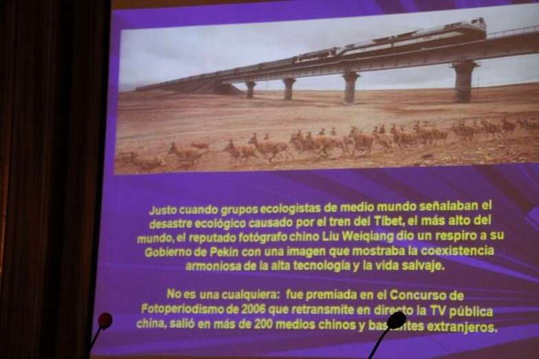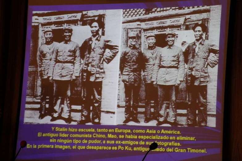 Fernández Belda expone: “Gracias por la presentación y muy agradecidos por estar aquí esta tarde. Lo que vamos a presentar y observar son imágenes, prácticamente todas imágenes, todas han sido publicadas en la prensa y no son mías, son tomadas de distintos medios, en la mayoría de los casos tengo las originales y tengo las transformadas, cómo se han publicado para ver clarísimamente cual ha sido el testigo de la manipulación, a veces sin fines peyorativos, su manipulación ha sido necesario, como verán en uno de los grandes fotógrafos españoles Mellado, dice que un negativo antiguo o una captura digital en las cámaras modernas es una partitura que tiene que ser interpretado y ya sabemos que cada partitura puede ser interpretada de una forma distinta. Por tanto en cualquier momento si quieren alguna aclaración sobre las mismas, lo pueden decir con toda claridad y hablamos sobre ellas.