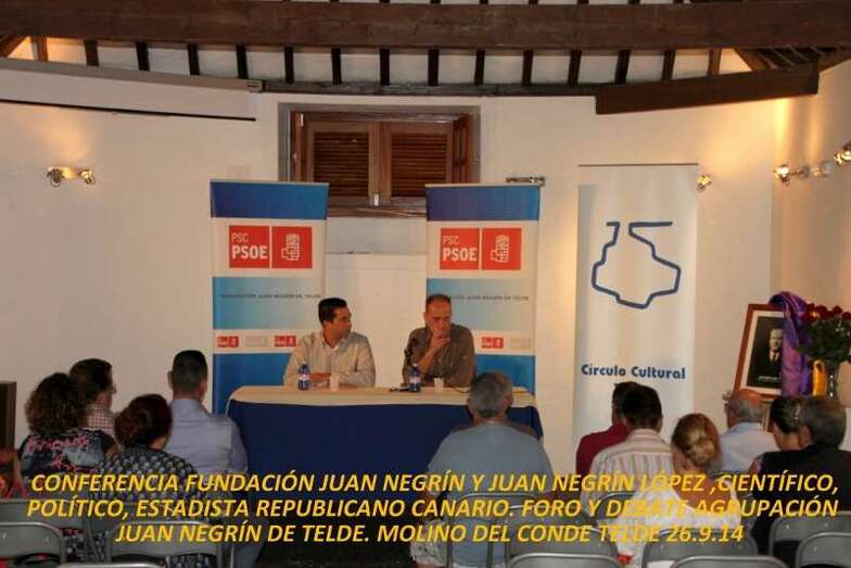 El viernes 26 de septiembre tuvo lugar organizada por la Agrupación Socialista Juan Negrín de Telde, dentro del programa de actos de Foro y Debate, en el Molino del Conde sede del Círculo Cultural de Telde, la conferencia sobre la Fundación Juan Negrín de Las Palmas de Gran Canaria y la figura del político y científico canario D. Juan Negrín López, impartida por Sergio Millares Cantero, asesor histórico de la Fundación, en principio programada para ser expuesta por D. José Medina Jiménez, presidente de la Fundación.