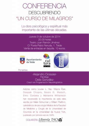 Telde.- La Concejalía de Cultura a través de Gestel trae a Telde la conferencia Descubriendo. Un Curso de Milagros a cargo del psicólogo especialista en hipnosis clínica y terapia de conducta, Alejandro Croissier y Delia González, coach en Programación Neurolingüística. El próximo jueves 9 de octubre, a las 20.00 horas, se realizará en el Teatro Juan Ramón Jiménez una charla introductoria a esta iniciativa, la obra de mayor repercusión para la moderna psicología espiritual.