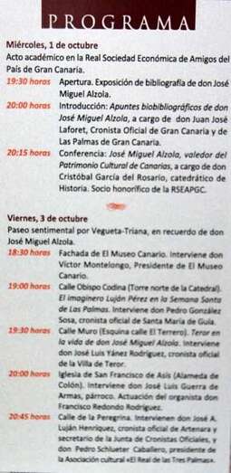 El miércoles se inició el programa con un acto académico presidido por Tomás Van de Walle, director de la Real Sociedad Económica, María Isabel García Bolta, concejala del Área de Gobierno de Educación, Cultura y Deportes del Ayuntamiento de Las Palmas de Gran Canaria; Larry Álvarez, coordinador de Cultura, Patrimonio Histórico y Museos del Cabildo de Gran Canaria; José Antonio Luján Henríquez, secretario de la Junta de Cronistas Oficiales de Gran Canaria y Cronista Oficial de Artenara; además de Juan José Laforet, Cronista Oficial de Las Palmas de Gran Canaria y Gran Canaria; y Cristóbal García del Rosario, catedrático de Historia.