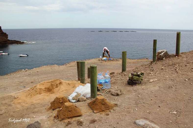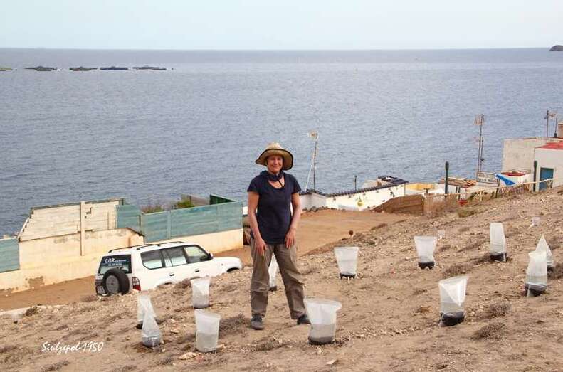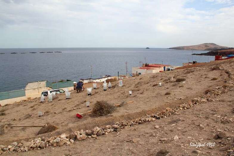 Tratamos de hacer un recorrido de las diferentes obras para fotografiar su estado de ejecución y empezamos por la más cercana a los aparcamientos, en este caso, la de la artista italiana Carlotta Brunetti y de allí seguimos por la carretera de la Punta de Malagatos, para encontrarnos con el artista holandés Johan Sietzema en plena faena. Más al sur desarrollaba su obra la australiana Sally Kidall.