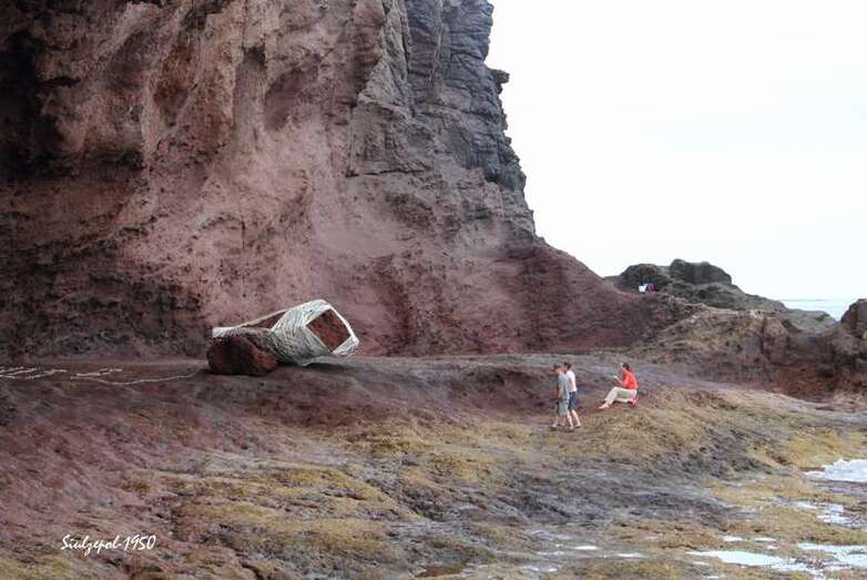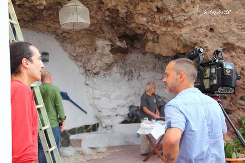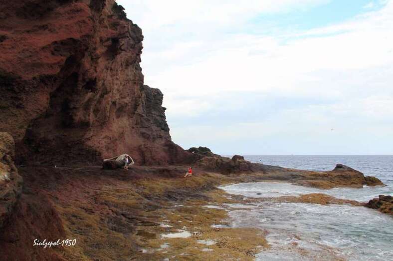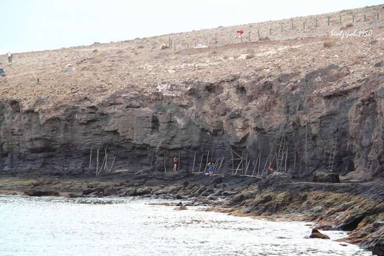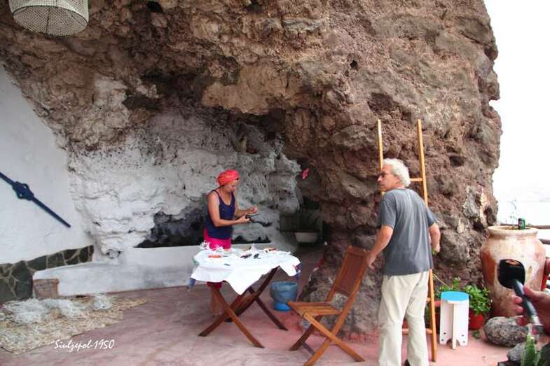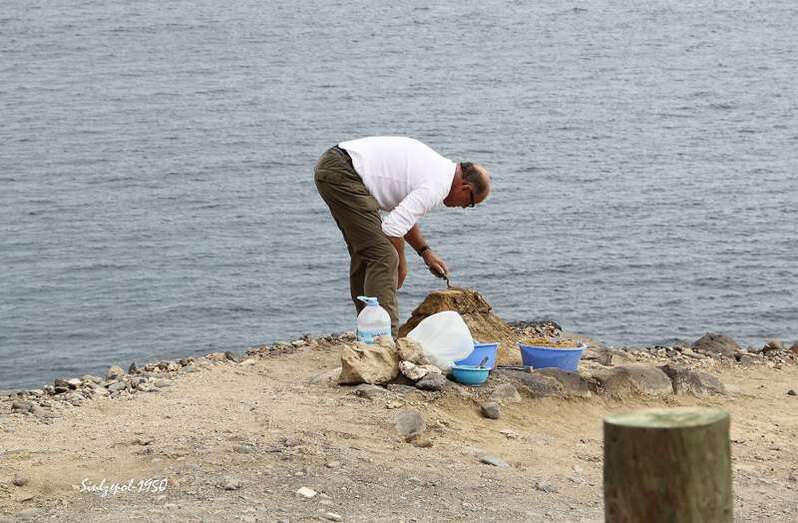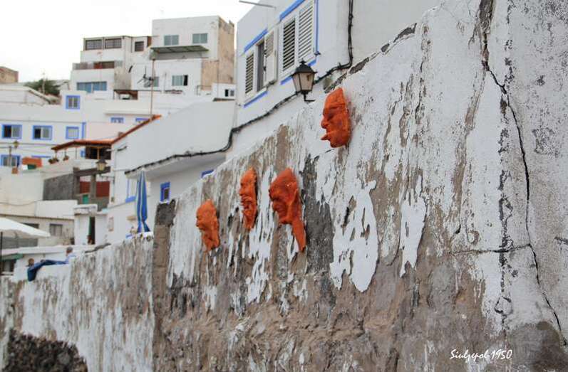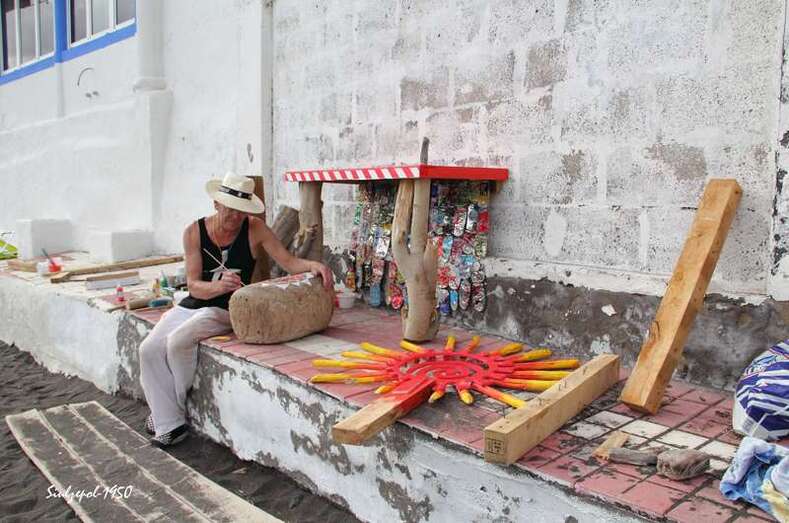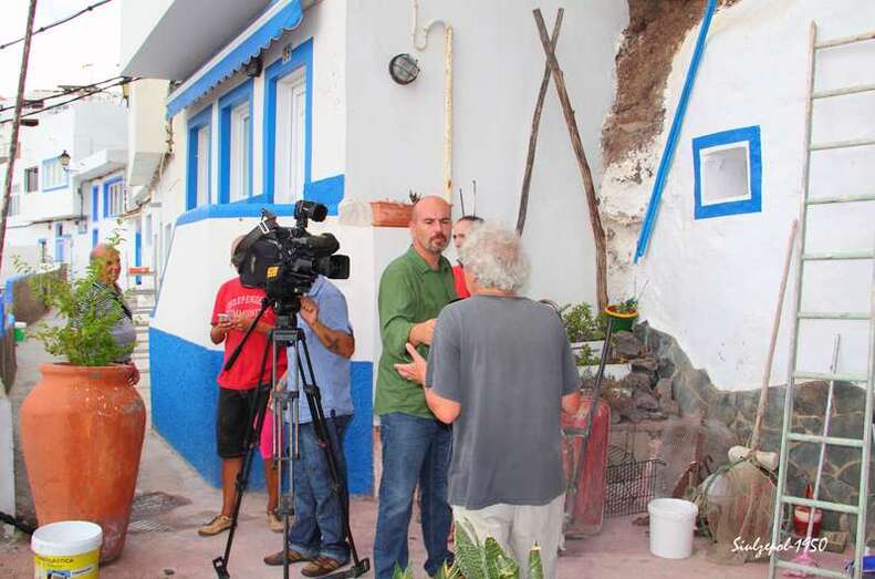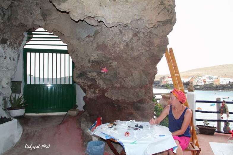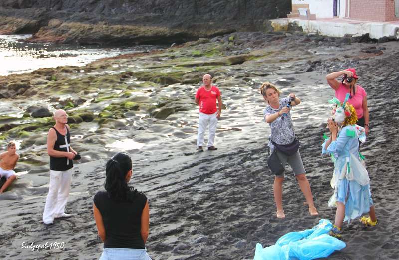 Caminamos por los riscos hasta llegar debajo de “La Paredilla”, donde el francés Fred Martín y su esposa realizaban su obra en unas grandes piedras allí existentes. Ya de regreso visitamos una de las cuevas existentes al norte de la playa y allí nos encontramos otra vez a la gente de la televisión entrevistando al francés Olivier Huet al cual acompañaba además su esposa Margrit Neundorff en la ejecución de su interesante obra.