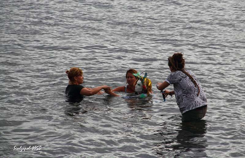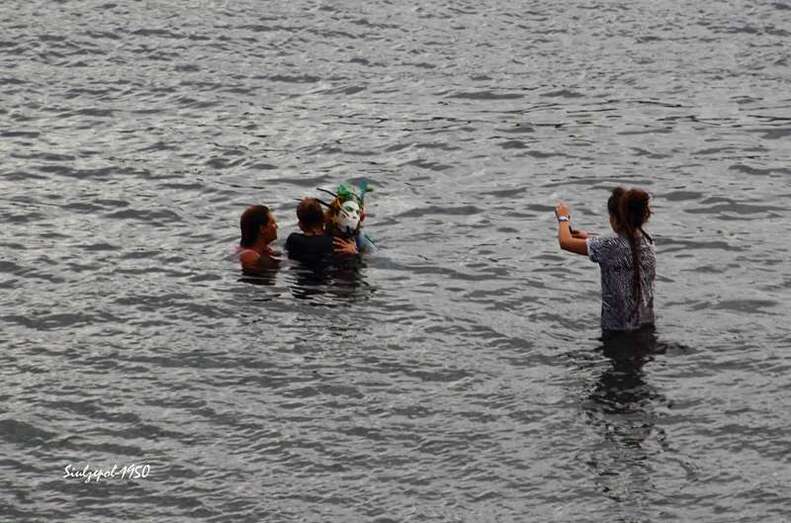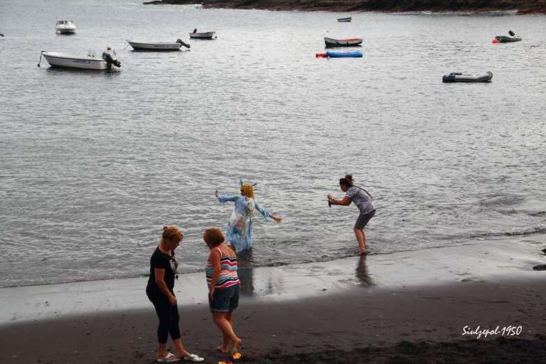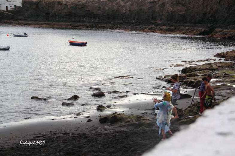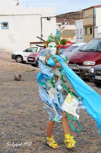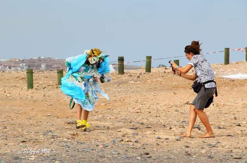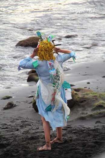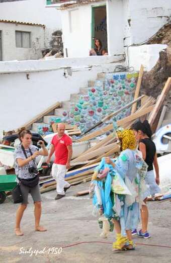 Fue allí donde nos sorprendió la artista norteamericana Cherie Sampson, que ataviada de una forma muy extraña, con material basura (plásticos, latas de refrescos, etc.) y con una careta puesta, realizaba una danza, que a la vez que expresaba con mímica exclusivamente. Era una crítica a la agresión medioambiental y el amor que debiéramos tener a la naturaleza, como parte esencial de nuestra existencia. Su danza sería a través de todo el barrio, bajando por las calles hasta llegar a la playa, a su paso se iban sumando los vecinos y visitantes, que curiosamente trataban de interpretar sus gestos y acciones. Finalmente en la playa, entró en el agua acompañada por dos vecinas de la zona y terminaron fundiéndose en un abrazo cual compromiso de lucha, por la protección medioambiental.