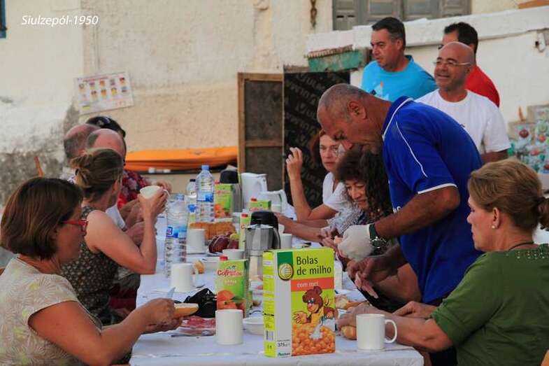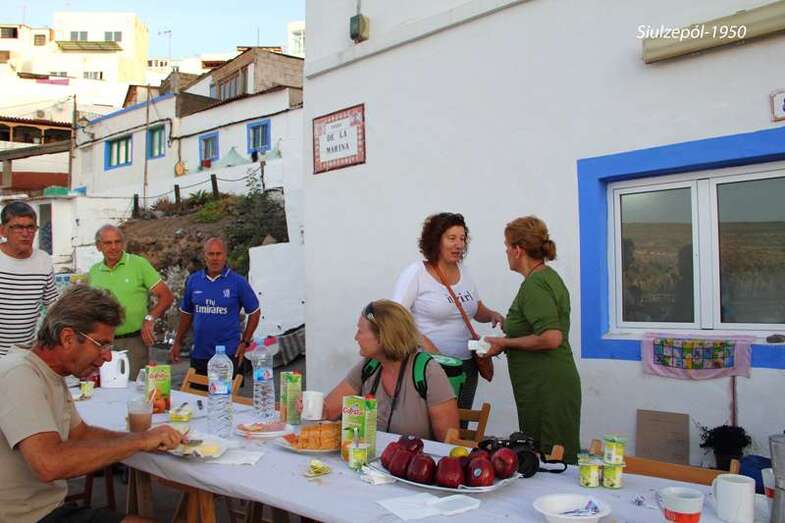 Mientras bajábamos, vimos en la Avenida de la Marina, la mesa comunitaria y tanto los artistas como los miembros de la Asociación desayunaban placenteramente. Una amena tertulia que denotaba no solo una gran amistad, sino una entrañable familiaridad nacida de la buena convivencia entorno a una justa razón: “la defensa de las viviendas de la Playa de Tufia”.