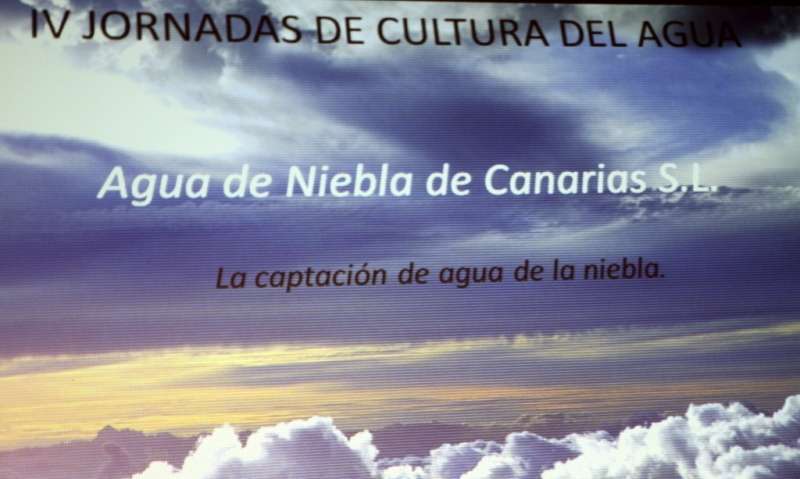 Interviene Ricardo Gil Casanova que expone: “Agradecer a las Jornadas de la Cultura del Agua mi invitación. La empresa de la que soy socio fundador se dedica a la captación de agua de niebla, y nosotros lo que queremos tratar es que se vea la captación de agua de niebla como una forma más de obtener agua. No como un recurso hídrico que sustituye a los que ya existen sino que se reconozca como una nueva forma de obtener agua. El mar de nubes es nuestra materia prima nosotros recogemos el agua de las nubes, sino hay nubes no se recoge agua. Esto funciona como las demás energías renovables, las fotovoltaicas dependen de la cantidad de luz solar, y la eólica, si no hay viento no hay energía, en nuestro caso si no existen nubes no recogemos agua.