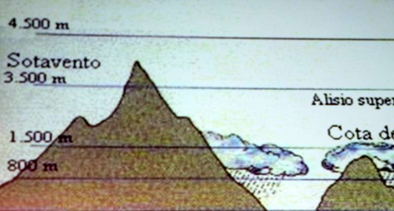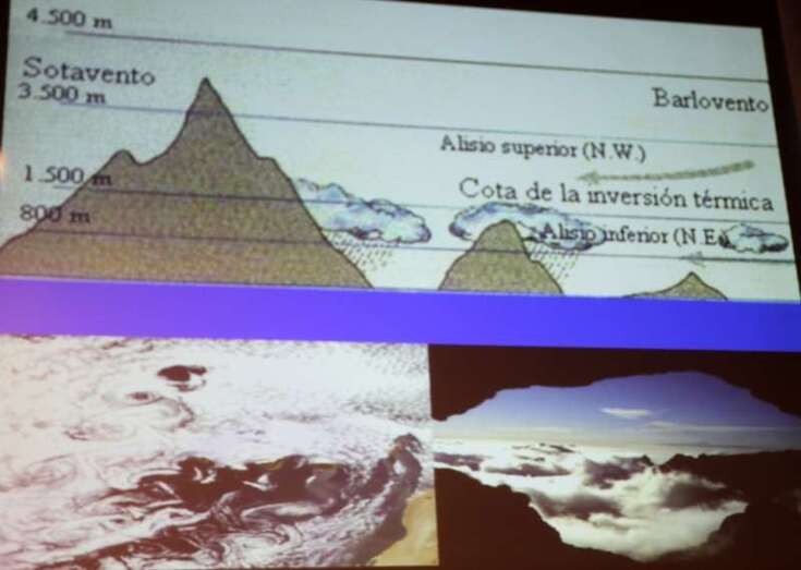 Cuando esta capa inferior llega a una isla de escasas alturas, al estar esta capa húmeda en contacto con el suelo más caliente, lo que va a producir son pequeños cúmulos o nubes. Cuando el obstáculo es en una isla de mayor relieve y tiene una altitud de la inversión térmica, la nube empezará a deslizarse por la ladera de la montaña y cuando entra en contacto con la vegetación, primero se formarán las nieblas que traen estas nubes, y cuando entran en contacto con la vegetación empezará a gotear agua. Cuando llega a una zona de crestería se producirá el efecto Foehn, en el lado de barlovento se queda la nube y en el de sotavento permanece un clima cálido y despejado. Cuando la altura del obstáculo es mayor a la altura de la inversión térmica lo que ocurre es que la inversión no deja subir a la nube y se queda estancada, se produce el efecto que llamamos mar de nubes. Esto es lo que produce nuestros recursos, la llegada de nubes y nieblas en las islas y cómo se depositan.