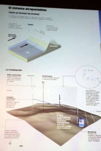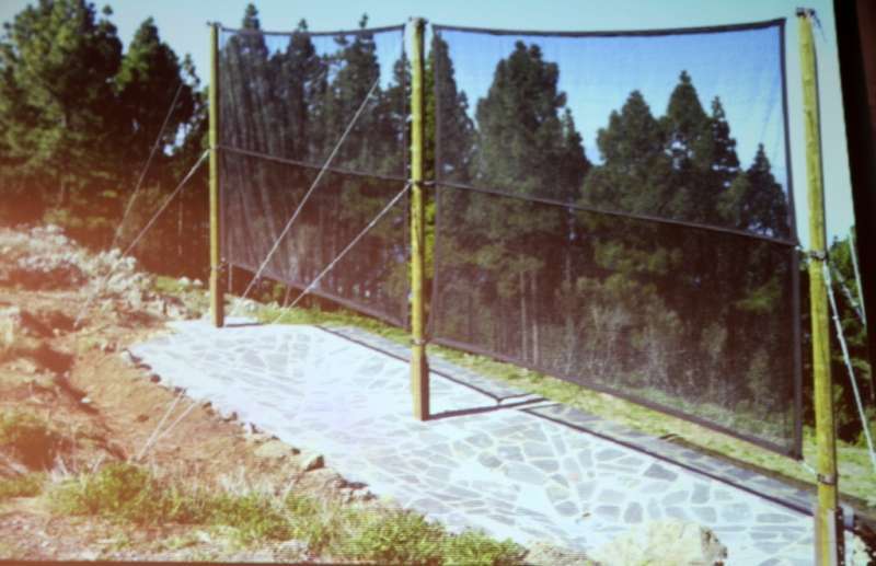 Formas naturales de captar el agua de la niebla. Los sistemas de captación de agua en otras partes del mundo vienen a ser similares a los que hay aquí en Canarias. En lo que se refiere a cómo se forman las nubes, las nieblas, brumas o como le llaman en cada sitio. Una zona fría donde se forma la nube y un obstáculo que es donde la niebla asciende y se precipita sobre él. La captación de agua de niebla se viene haciendo desde principios del siglo pasado y los sistemas que más han evolucionado son los captadores planos o tipo chileno que son los que han utilizado las ONG´s y las Universidades. El captador utilizado para toma de datos es el modelo llamado standard fog collector, 1X1 de van recogiendo los datos para verificar las posibles zonas de captación y los extrapolan a los captadores mayores. Estos captadores planos o tipo chilenos consisten en dos postes con una malla plástica, o tipo raschel, que tiene una abertura de 0,50 cm y se colocan perpendicularmente a la dirección de los vientos predominantes, porque de lo que se trata es poner un obstáculo a esos vientos para que se depositen las gotas.